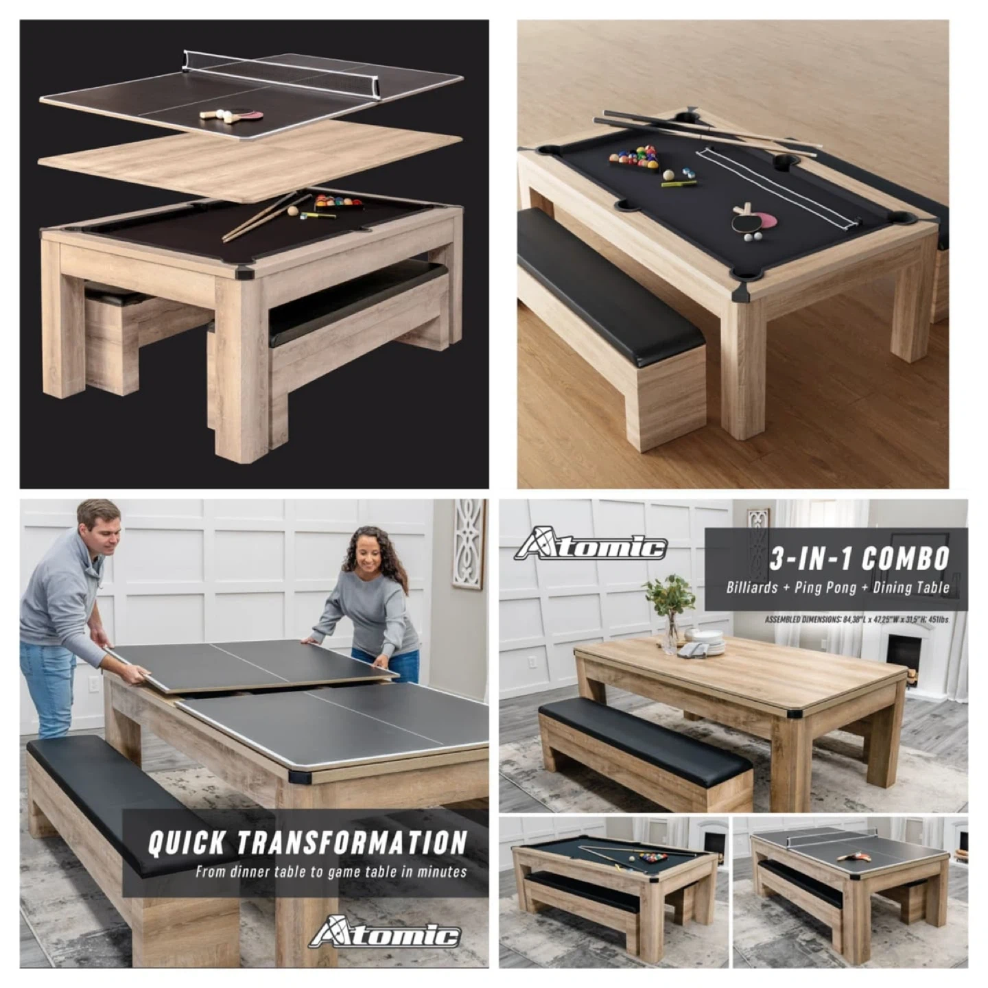Get ready for some serious fun with this Atomic 3-in-1 combo table! It easily transforms from a dining table to a billiards table to a ping pong table in minutes. Assembled dimensions are 84.38"L x 47.25"W x 31.5"H and it weighs 451lbs The table was bought a year ago and has only been used twice, both for pool and table tennis.