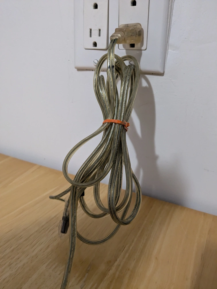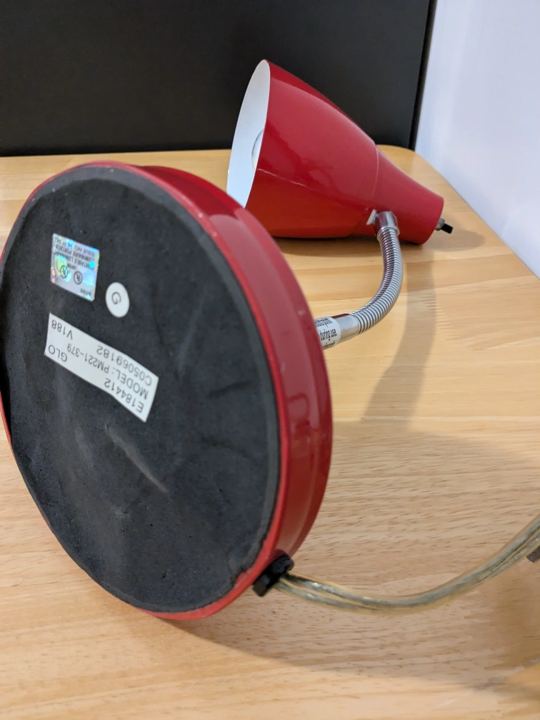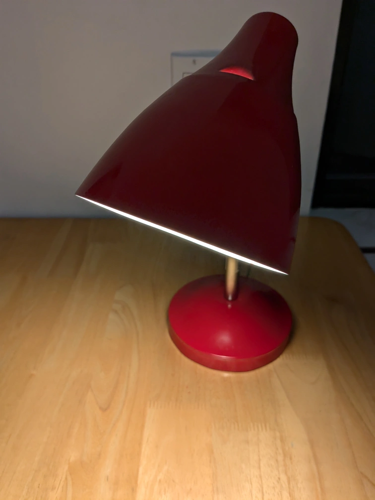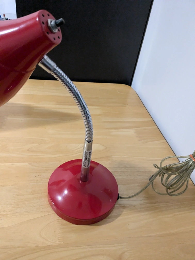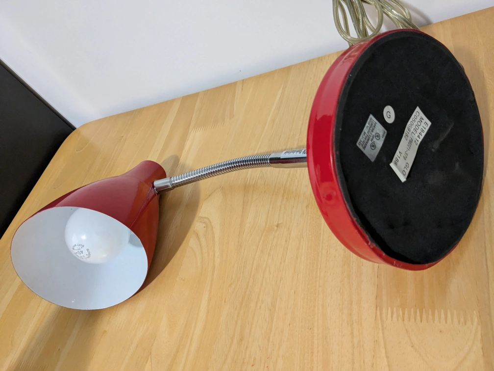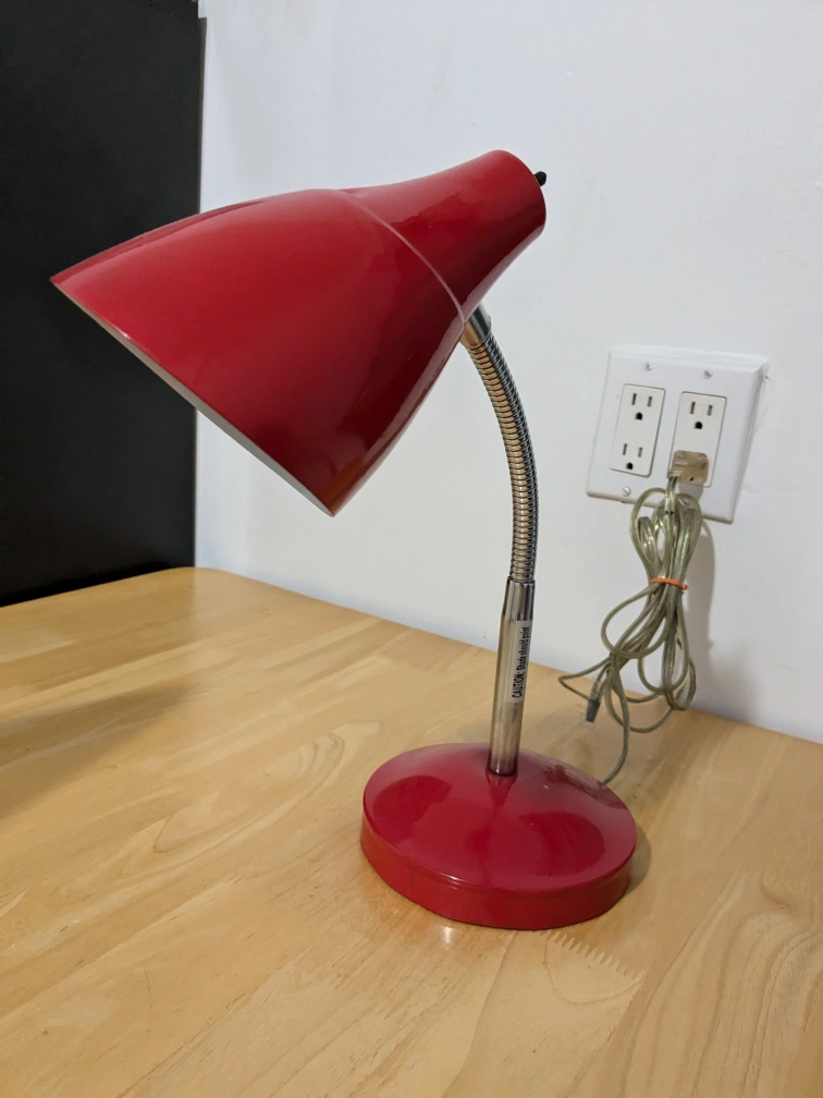 The desk lamp is a simple, modern, red design that features a flexible arm. The shade is adjustable and the lamp comes with a plug-in cord.