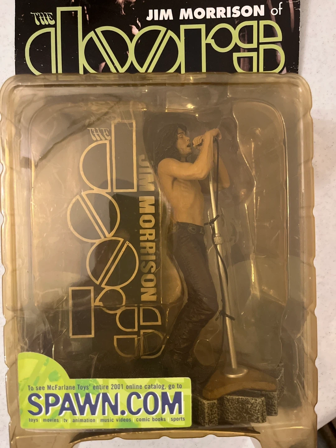 65Jim Morrison action figure from McFarlane Toys! The figure is still in its original packaging. The bare-chested Lizard King action figure stands more than 6 inches tall and comes with stage base, microphone, and stand.