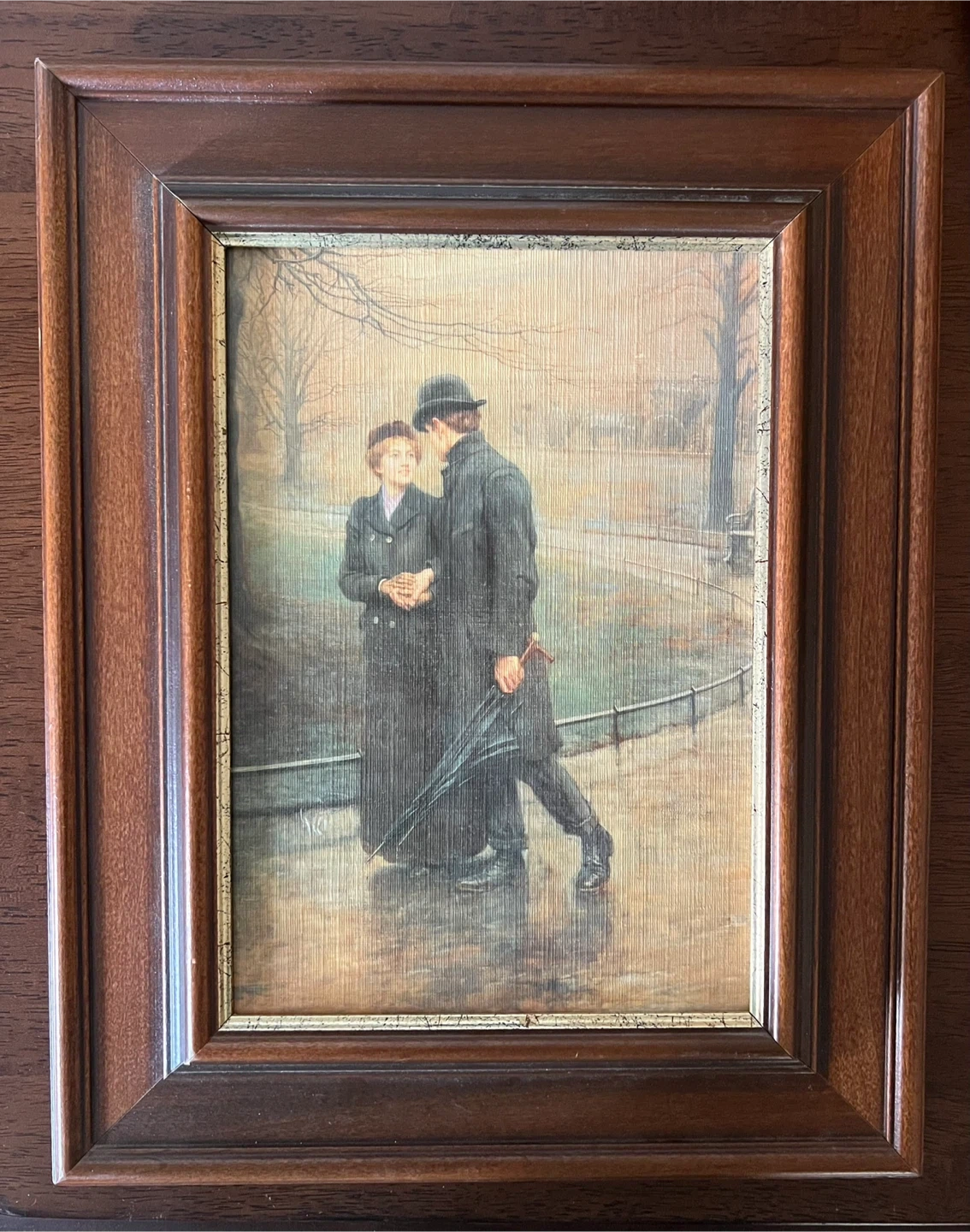 “The Garden of Eden” The painting depicts a young couple walking through Kensington Gardens in London on a rainy day. 11 1/2 x 14 1/2
