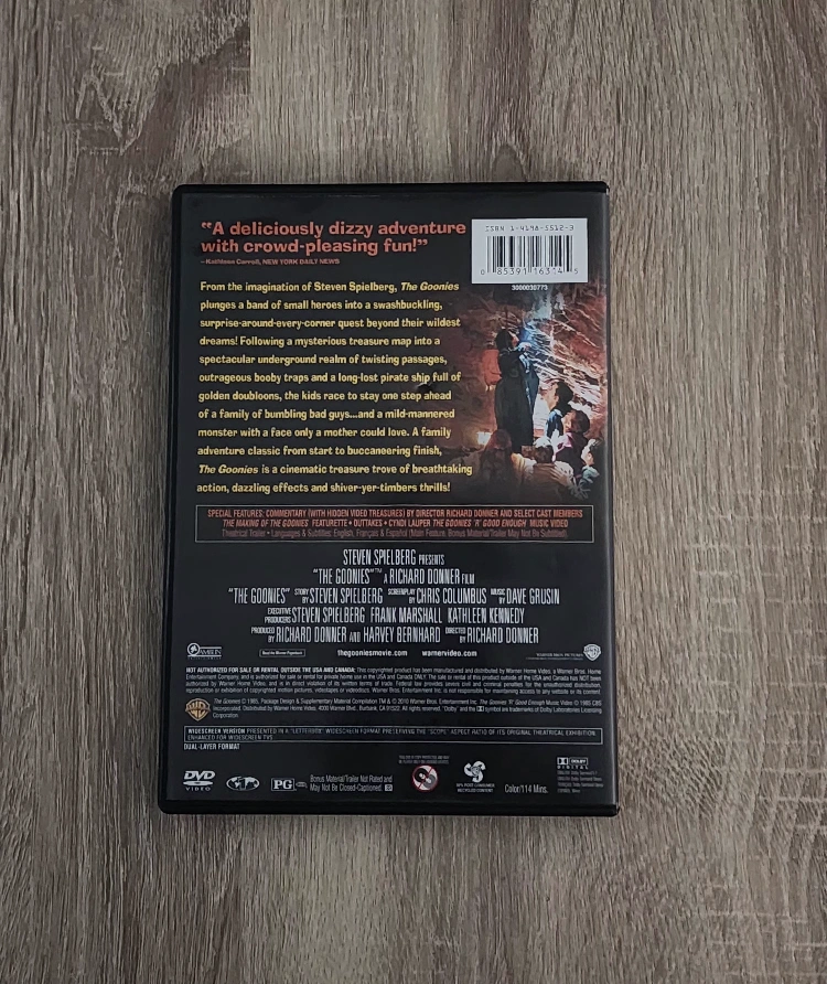 60Selling a DVD of The Goonies! It's a classic adventure film directed by Richard Donner and presented by Steven Spielberg. The DVD is in good condition and comes in its original case. Perfect for a PG family movie night!