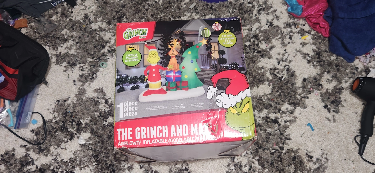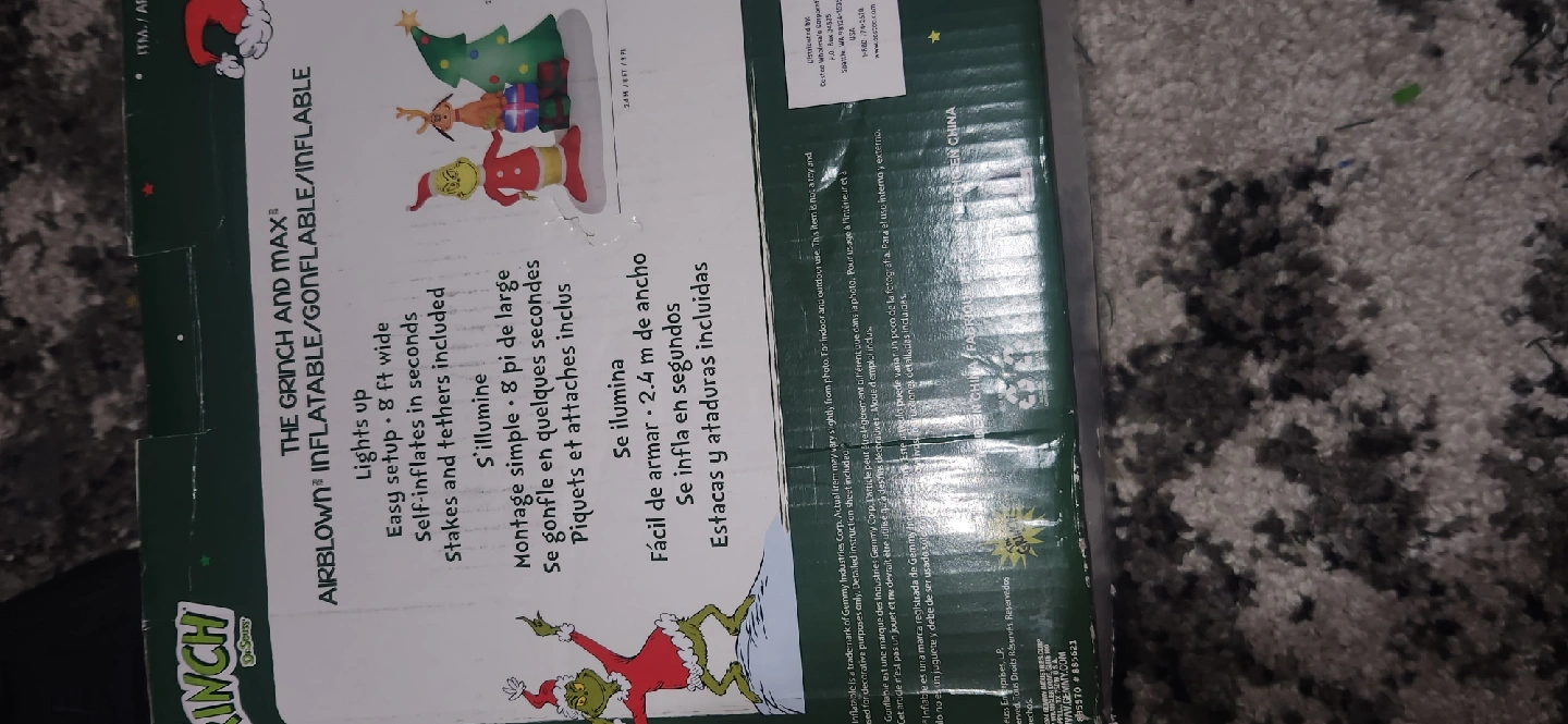 15make offer. Get ready to decorate for the holidays with this fun Grinch and Max Airblown inflatable! It's 8 feet wide and inflates in seconds. It also lights up and comes with stakes and tethers included. Box is included!