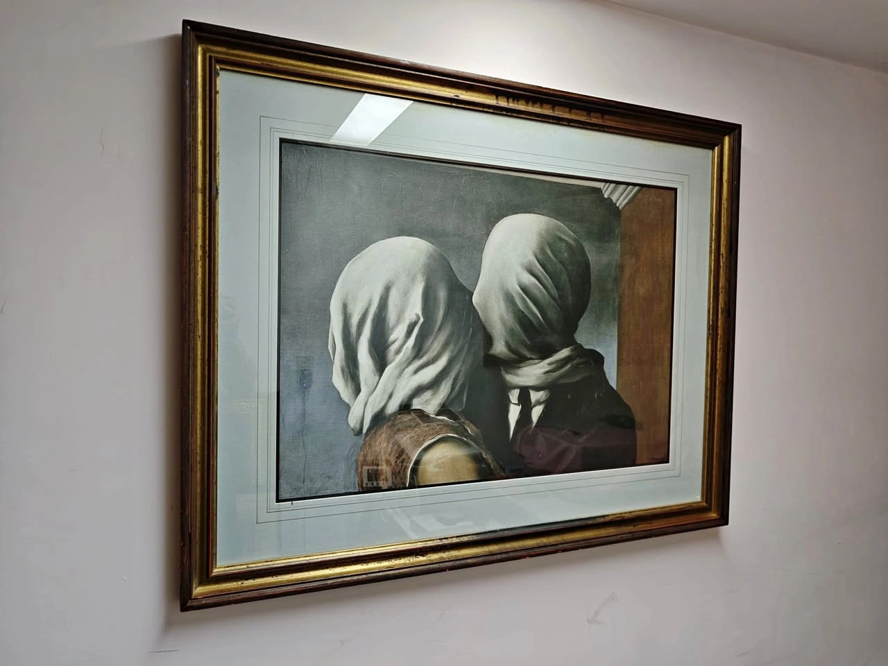 70This is a painting titled The Lovers (Les Amants), created in 1928 by the Belgian surrealist artist René Magritte. The Lovers Print – 43" x 34". This appears to be a reproduction of an iconic surreal artwork. The wooden frame is vintage, solid, and quite heavy, adding real character to the piece. It shows some signs of age and a few imperfections on both the frame and matting, but the canvas artwork itself is in excellent condition and still looks stunning when displayed. Pickup or drop off for a small fee.