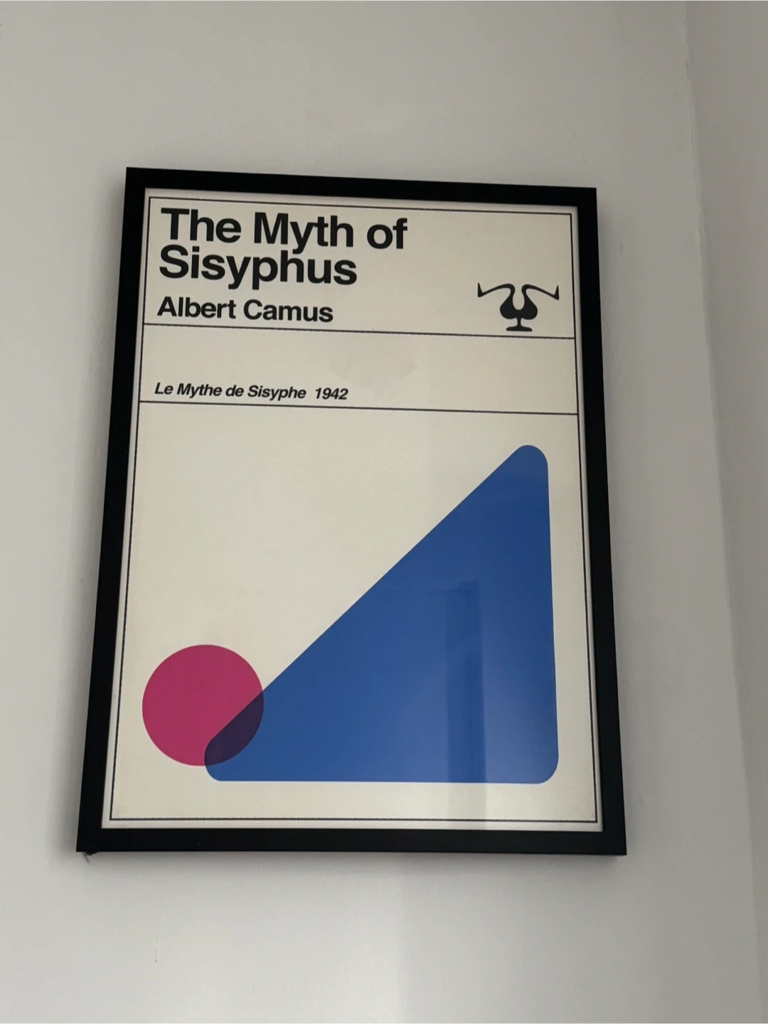 Selling a framed print of "The Myth of Sisyphus" by Albert Camus. It features a minimalist design with a pink circle and blue triangle on a white background. The frame is black and in great condition. It's a stylish piece for any room, even a gym! Especially for the bookish person.