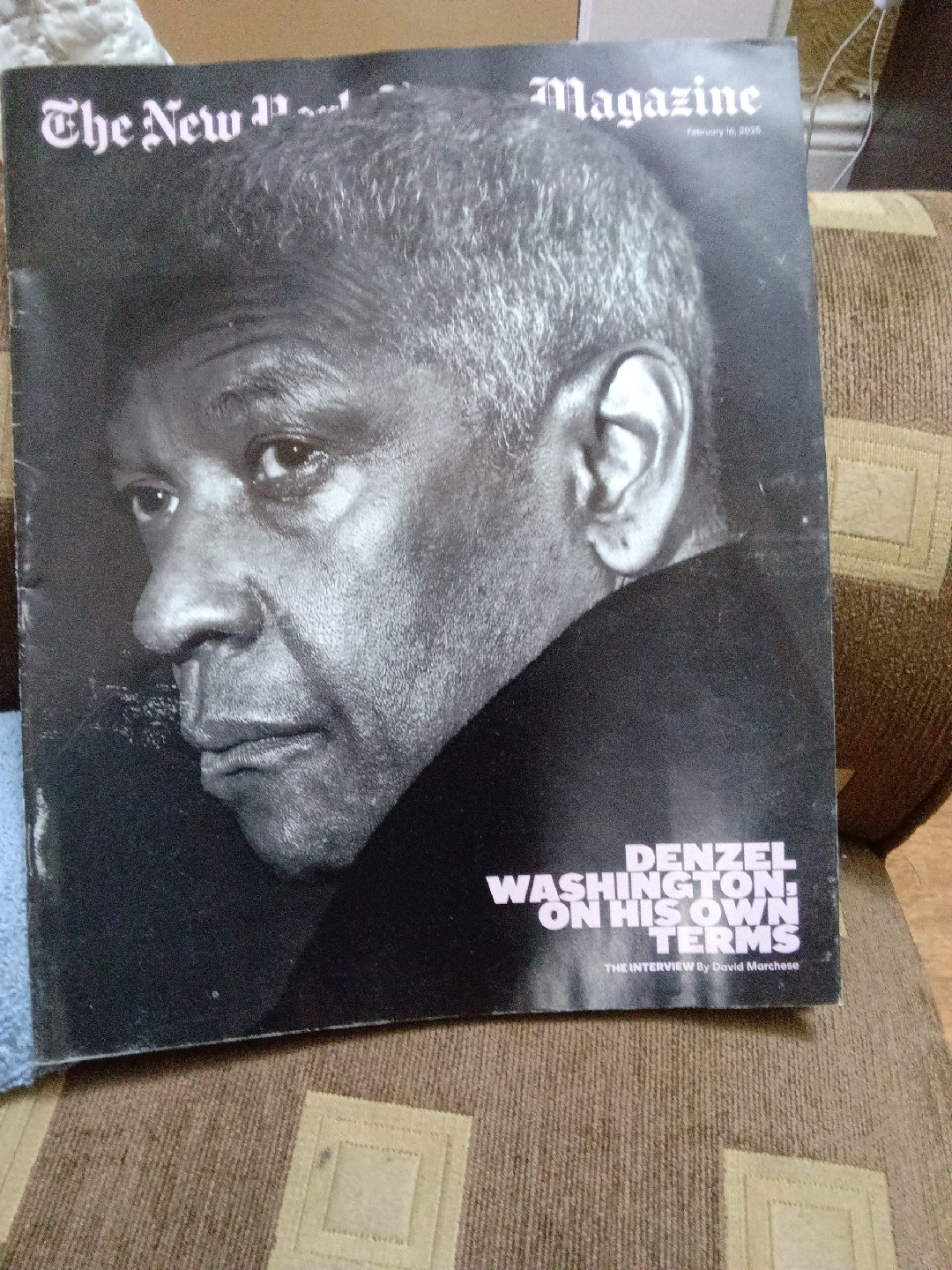 Selling The New York Times Magazine from February 16, 2025. It features Denzel Washington on the cover and includes an interview by David Marchese