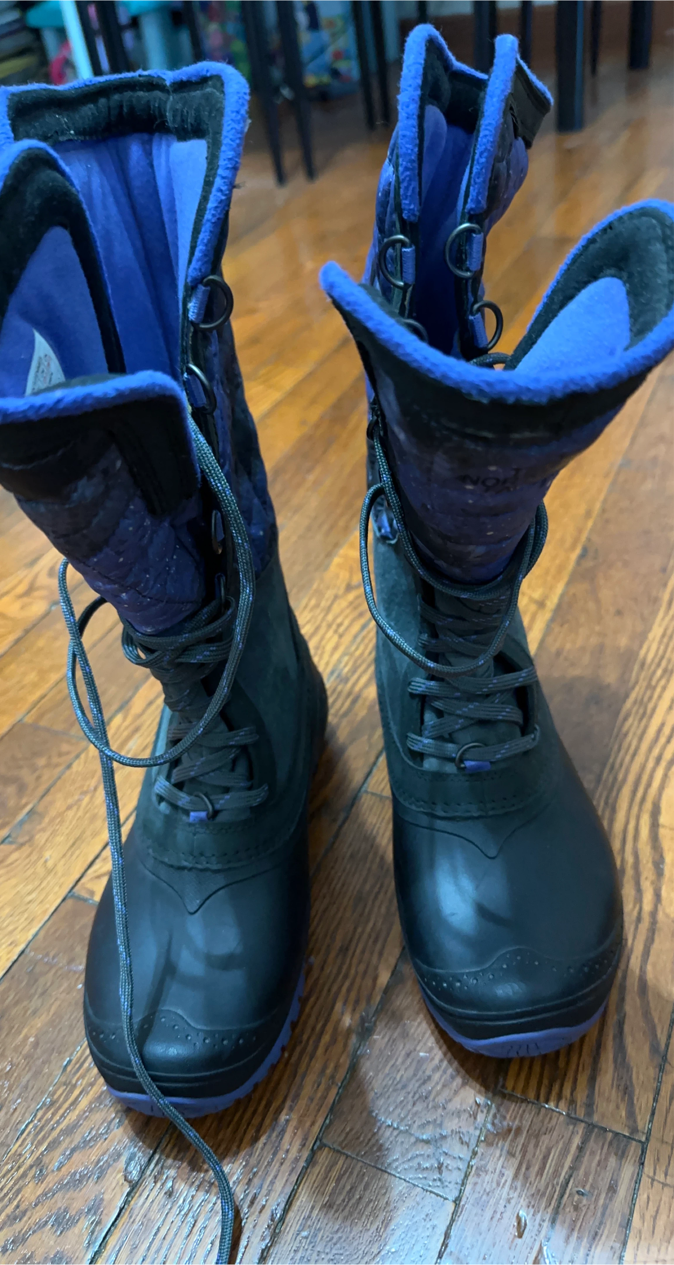 Here are some The North Face winter boots! They are black with blue accents and laces. They're perfect for keeping your feet warm and dry this winter season!