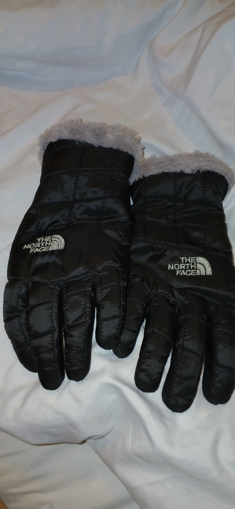 Selling a pair of The North Face gloves in black. They appear to be in good condition and ready to keep your hands warm! They have a furry trim. Size L (kids)