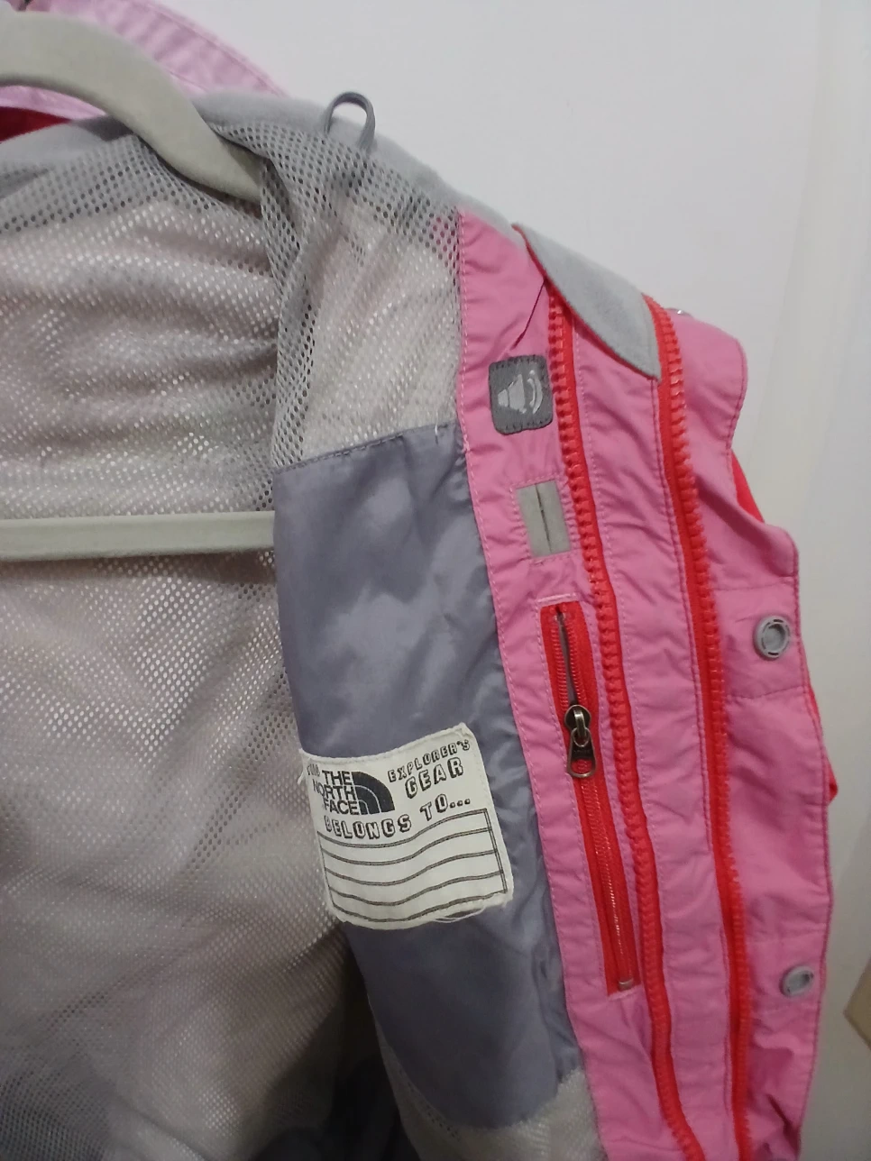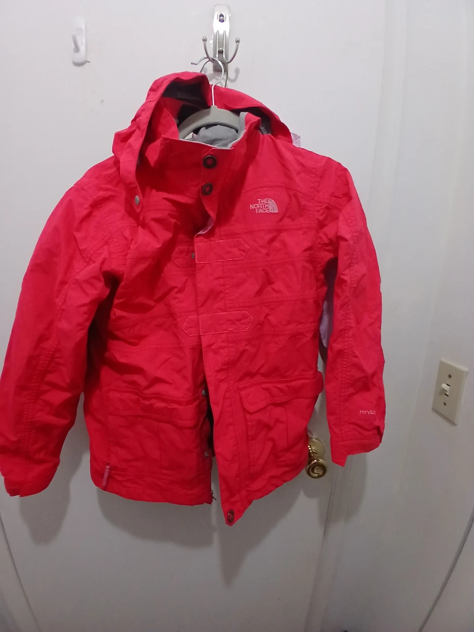 10Selling a The North Face ski jacket for girls. It features a vibrant red and pink color combination, perfect for staying visible on the slopes. The jacket is designed with functionality in mind, ensuring warmth and comfort during winter activities. It has a durable outer layer and a cozy inner lining to keep your little one protected from the elements