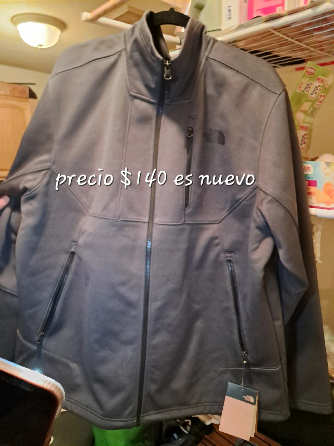 Selling a brand new gray jacket from The North Face! It has a full zipper, a small chest pocket, and two side pockets with zippers