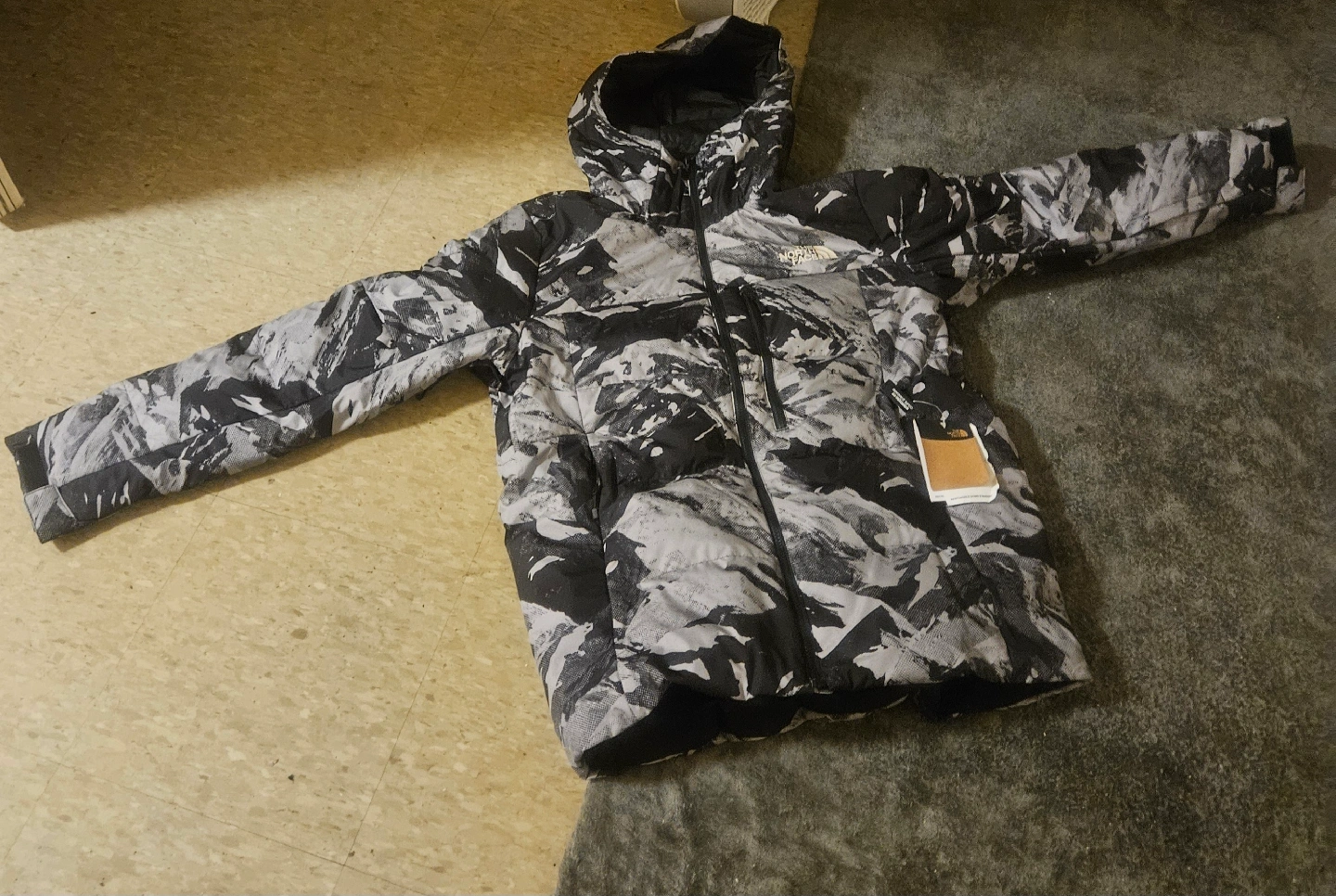The North Face Men's Corefire Down Jacket is a premium, all-mountain jacket designed for cold weather and active winter sports like skiing and snowboarding. It features a breathable and waterproof FUTURELIGHT™ fabric to keep you dry and comfortable in harsh conditions. The jacket combines 550 fill goose down insulation in the body with Heatseeker™ Eco synthetic insulation in the hood, side panels, and underarms for optimal warmth even in wet weather. It has a standard fit with a fixed, helmet-compatible hood, an exposed VISLON® center front zipper, and multiple secure zip pockets including an oversize chest pocket and wrist pocket with a goggle wipe. Additional features like underarm venting, a powder skirt to keep snow out, adjustable cuffs, and jacket-to-pant integration make it perfect for mountain use. The jacket is made with recycled materials and has a durable water-repellent finish, ensuring both performance and environmental responsibility. This jacket balances warmth, breathability, and weather protection, making it an excellent choice for cold weather outdoor enthusiasts who demand performance and style
