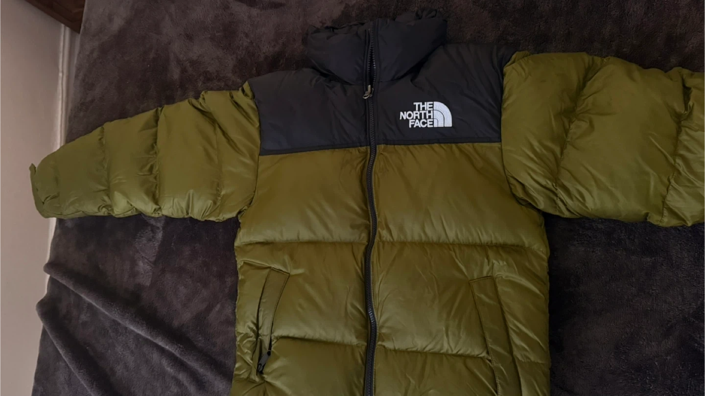 Selling a The North Face puffer jacket in olive green and black. It's in great condition and super warm for the winter months! The size is not visible from the images. Talla XXS