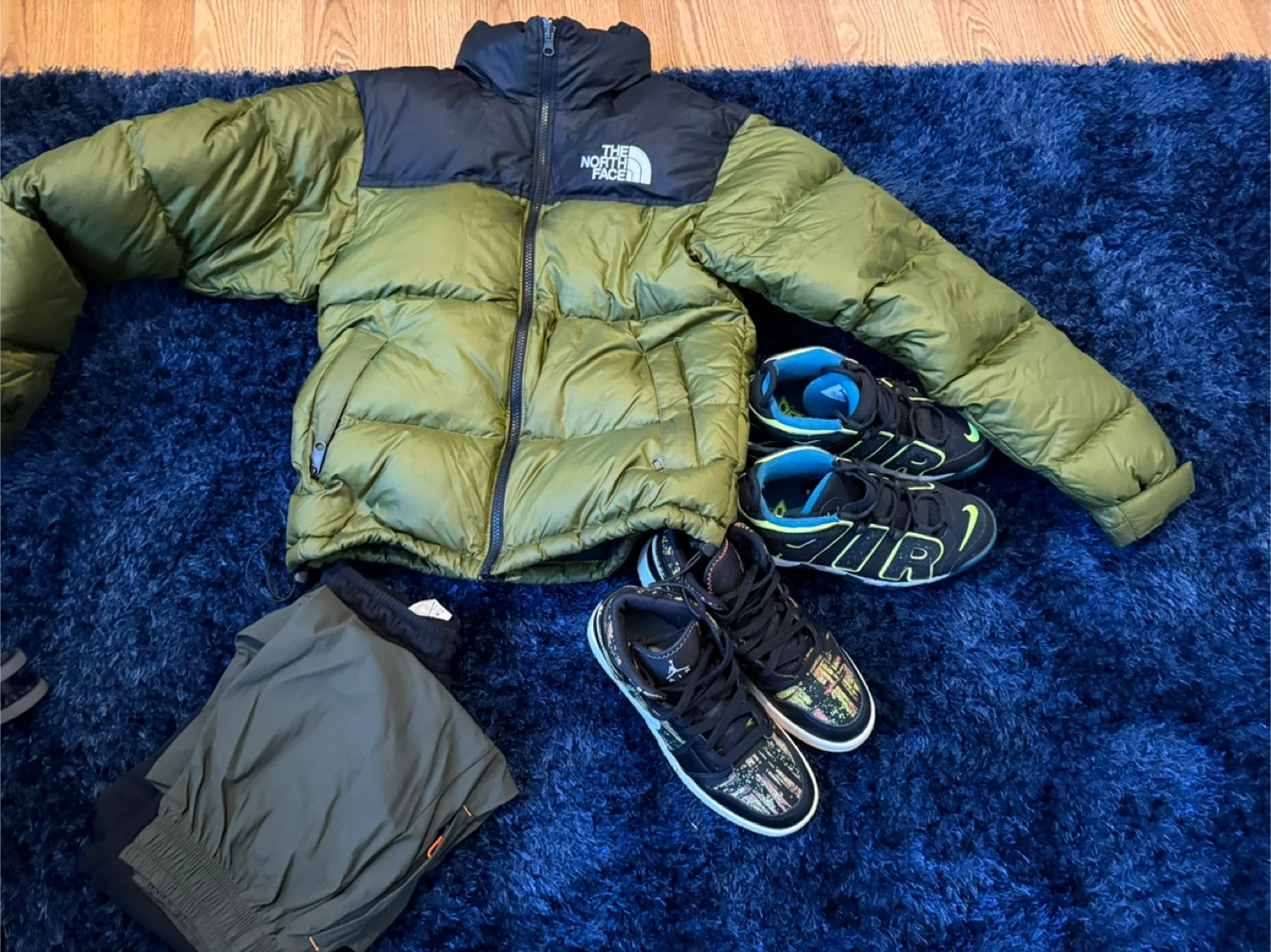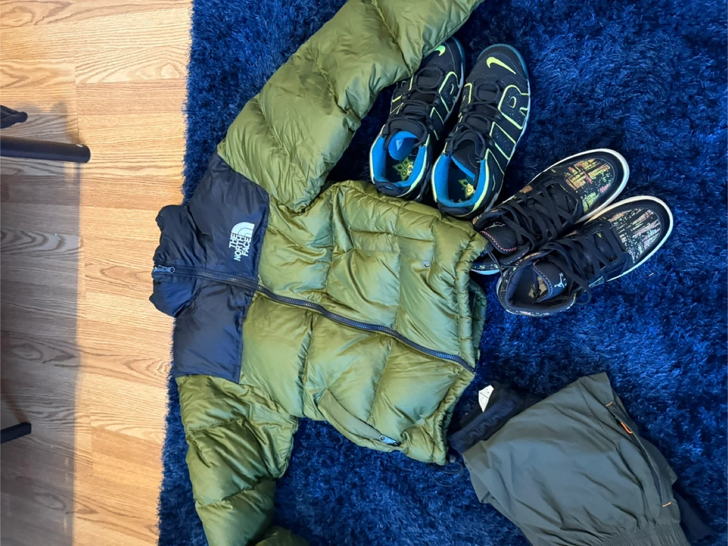 Selling a The North Face puffer jacket and a pair of Nike Air More Uptempo shoes. Both items are in good condition and ready for a new home