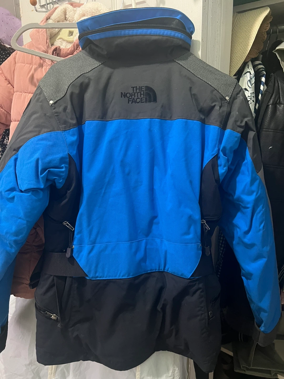 The North Face Steep Tech jacket in blue, gray, and black. This stylish and functional jacket is perfect for outdoor activities or everyday wear. It features the iconic Steep Tech design with multiple pockets and durable construction. Great for staying warm and looking cool!