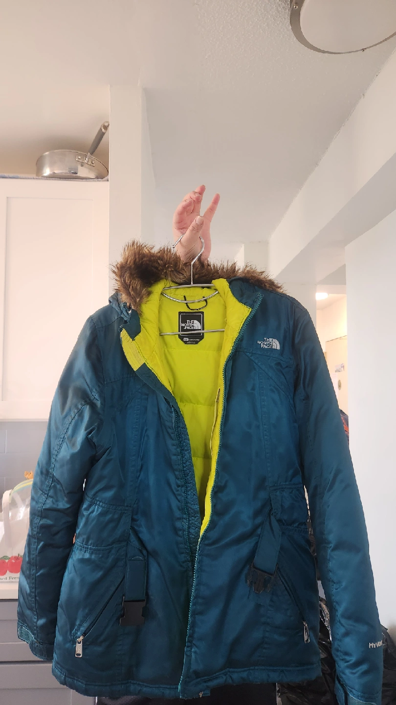 Selling a teal winter jacket from The North Face! It has a bright yellow lining and a faux fur-trimmed hood. Perfect for staying warm this winter