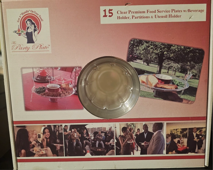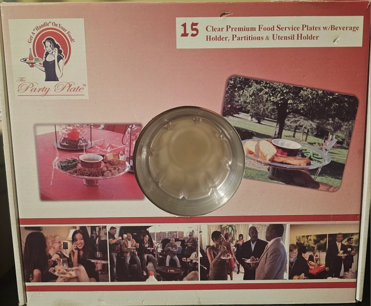 Selling a set of 15 clear premium food service plates from The Party Plate! These plates come with a beverage holder, partitions, and utensil holder. They're designed to be disposable but can also be hand-washed and reused. Perfect for parties where there aren't enough tables and chairs!