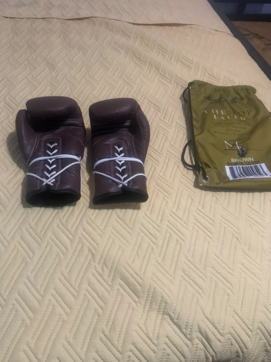 Selling a pair of The Pop Laced hand-crafted, pro-style boxing gloves! These are brown and weigh 16 oz. They come with the original bag LMK TAPP INN📲📲📲