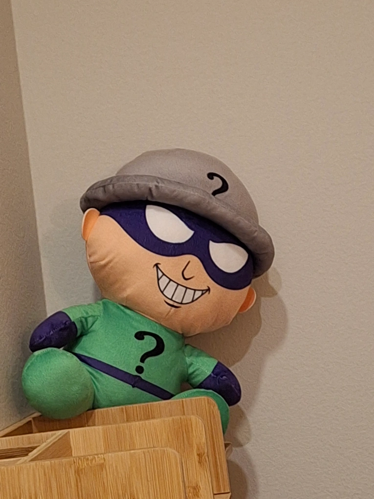 Here's a plush toy of The Riddler! It's in great condition and ready for a new home. Perfect for any Batman fan or collector of DC Comics memorabilia