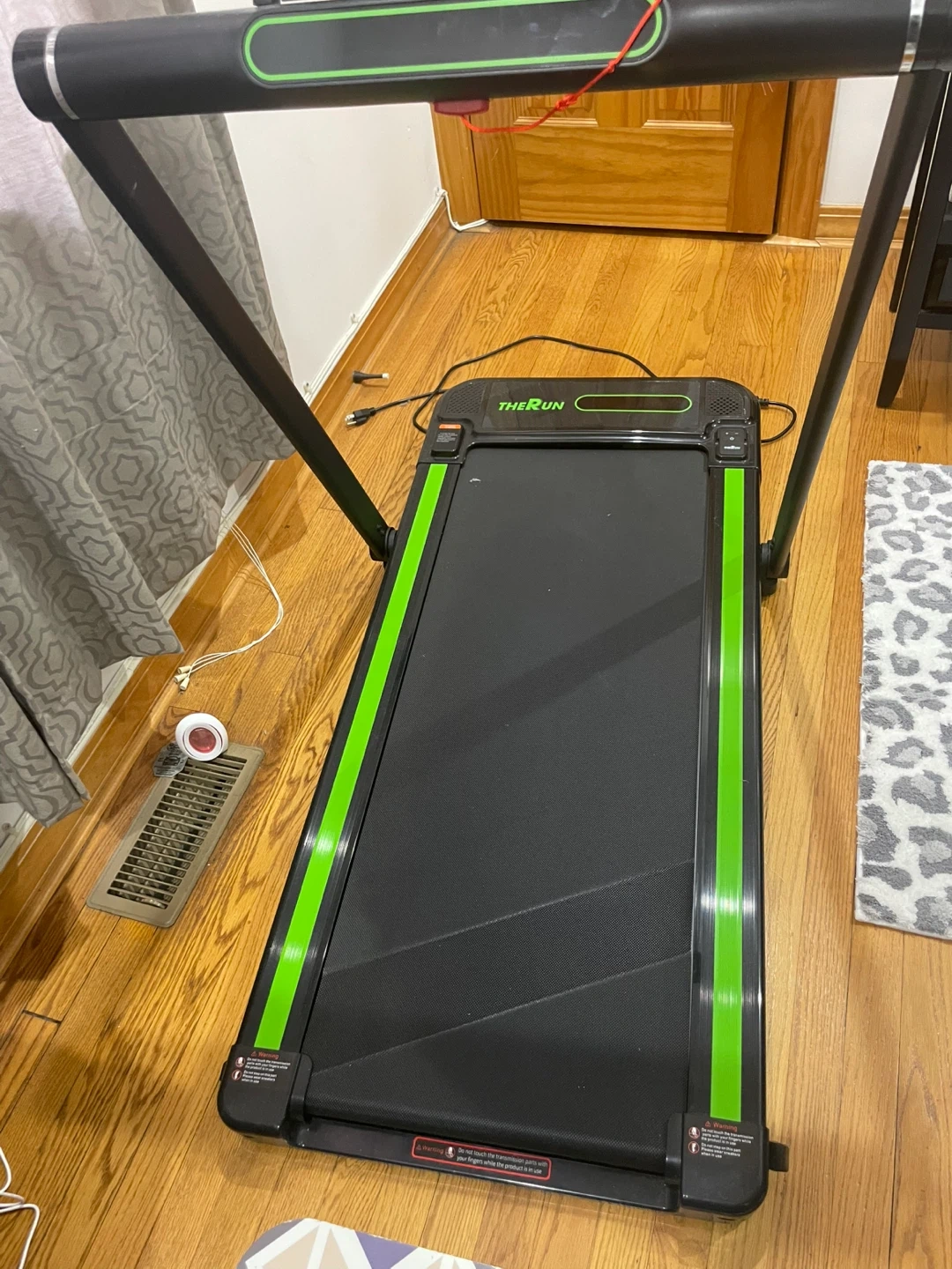 152Selling a THE RUN treadmill in black with green accents. It appears to be in good condition and includes a power cord. Perfect for getting your steps in!