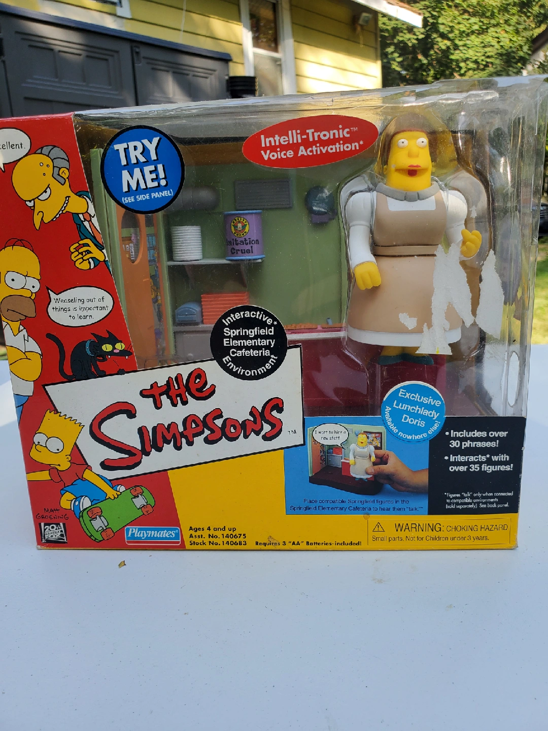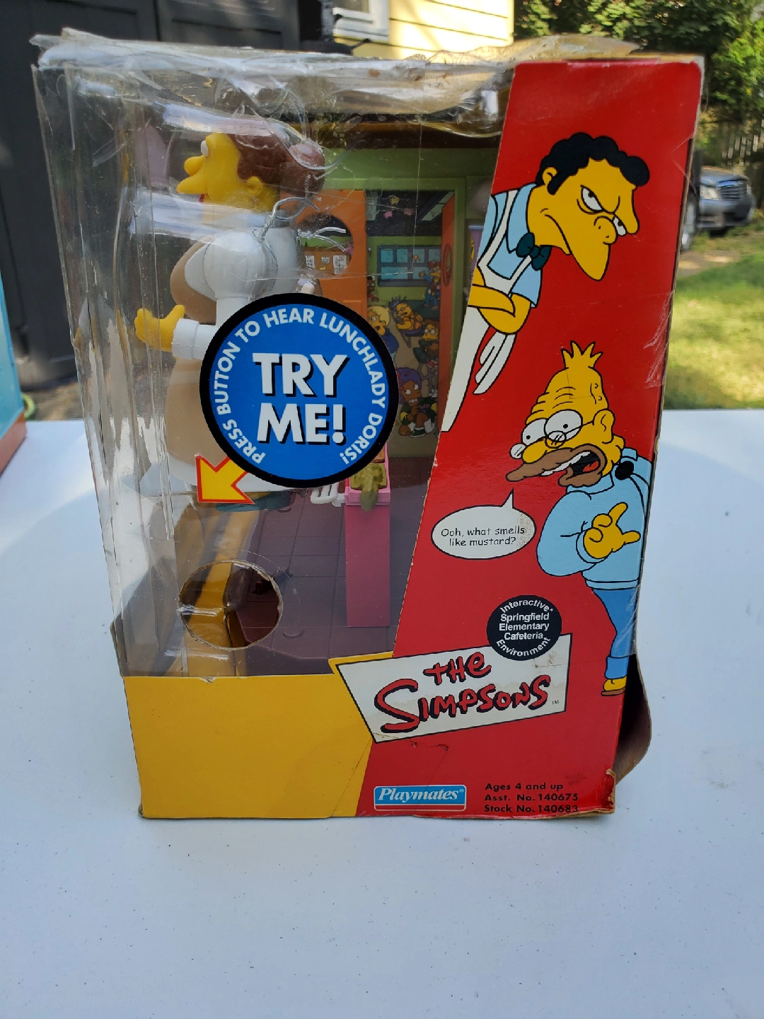 The Simpsons 2001 WOS World of Springfield Cafeteria Interactive Environment playset. New in box, never opened. The box isn't in great condition if that matters to you. It says multiple phrases from each figure that is put onto it. It includes the environment and one Lunch Lady figure and accessories. It also works with other interactive figures like Homer, Bart, Marge, and more. It's compatible with many figures to create a fun scene. This is selling for $70 plus tax on ebay. It's never been opened so obviously the batteries are dead so I can't test it without opening it. I also have other playsets listed an interactive Springfield Elementary Cafeteria Environment. It includes over 30 phrases and interacts with over 35 figures! Ages 4 and up. Comes in its original box