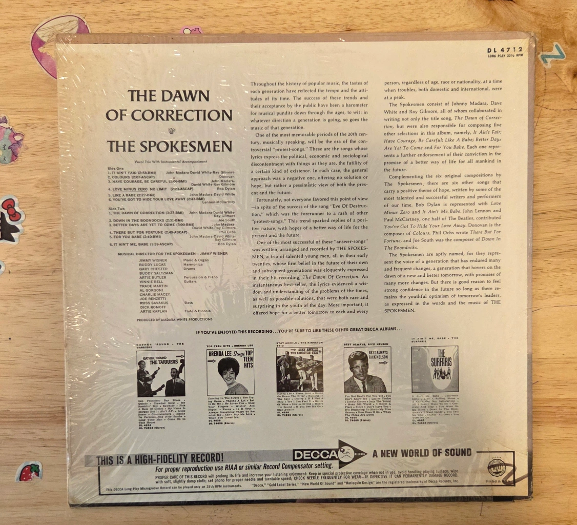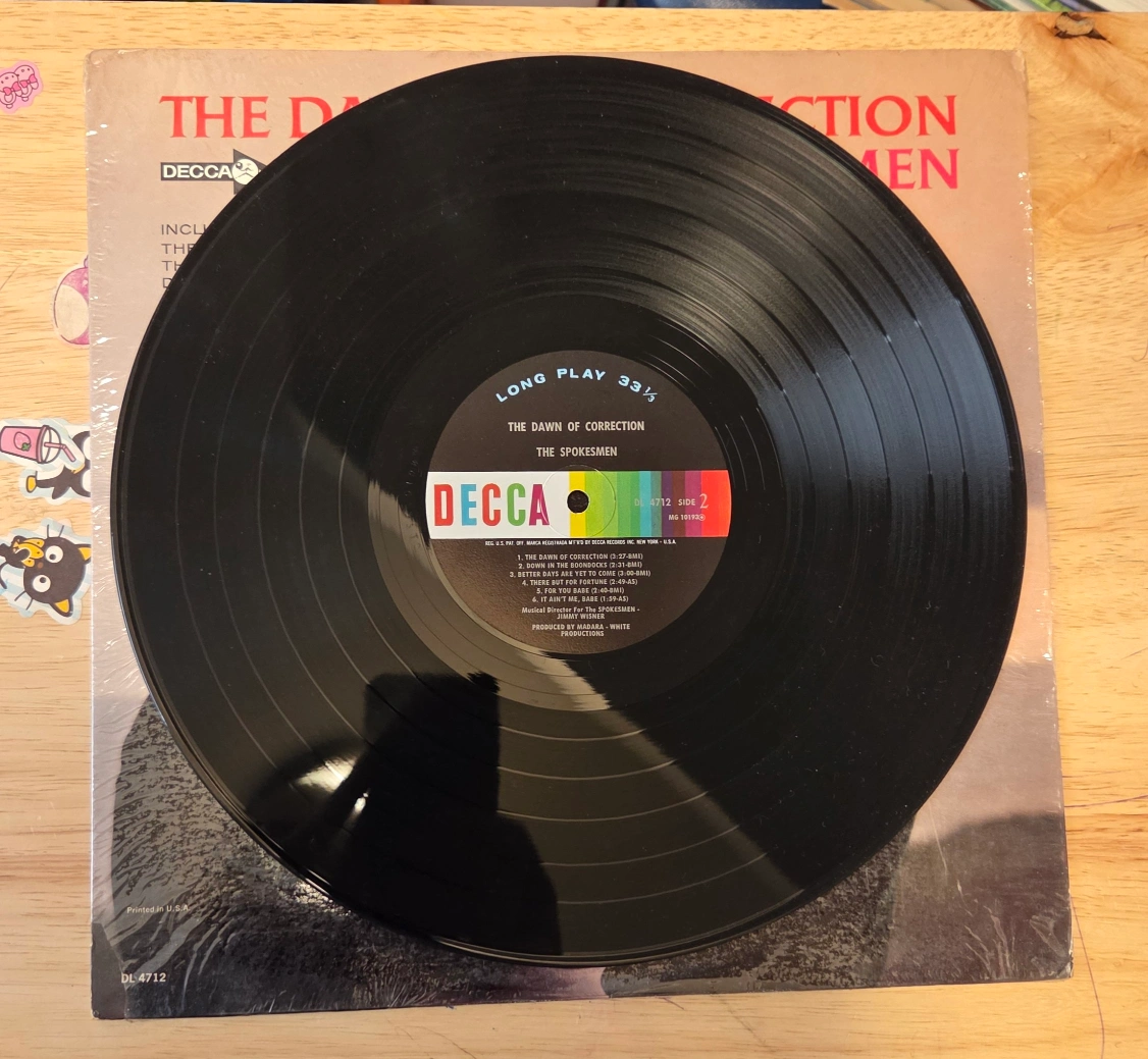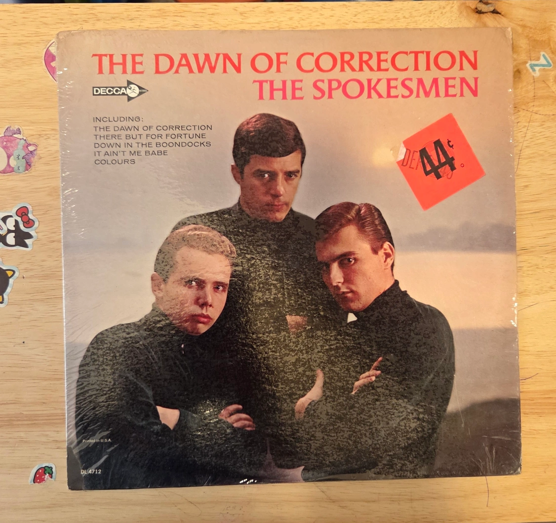 Selling The Spokesmen's 'The Dawn of Correction' vinyl record. A cool piece for any collector or music lover! It's a long play 33 1/3 record from DECCA. MEET UP ONLY CASH ONLY THANKS ALL RECORDS ARE VINTAGE THEY WHERE MY DADS HE PASSED HE BOUGHT THESE WHEN HE WAS YOUNGER HE WOULD HAVR BEEN 65 NOW, THEY BEEN SITTING IN STORAGE FOR A COUPLE OF YEARS THEY STILL WORK I PLAYED EACH ONE FRONT AND BACK