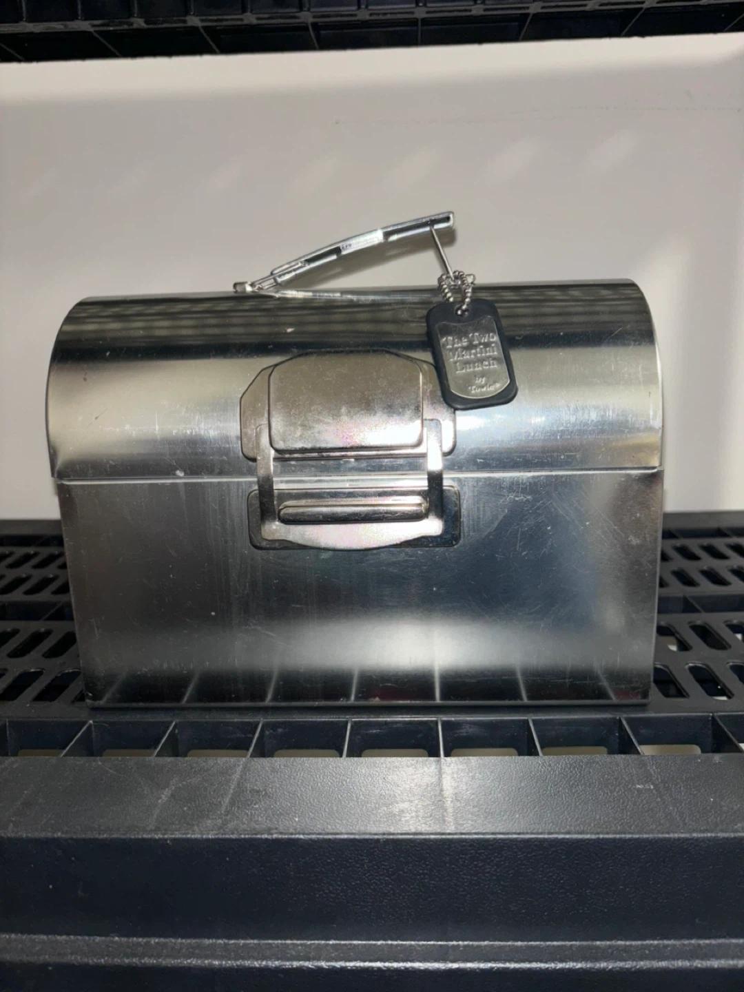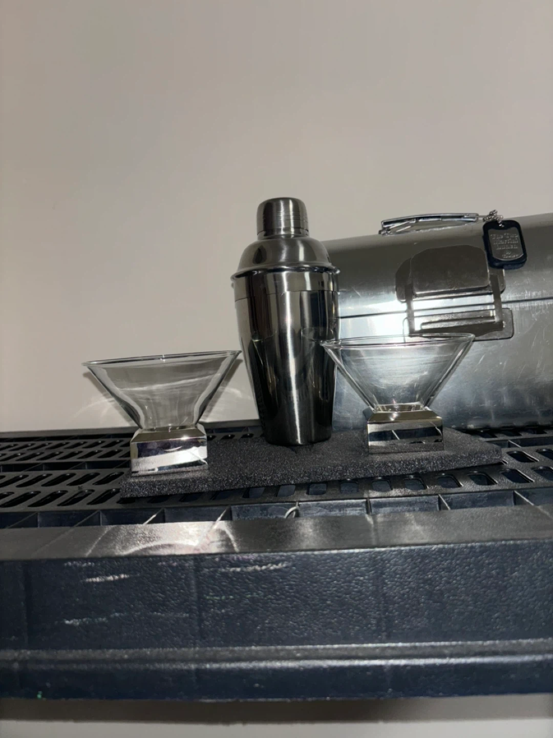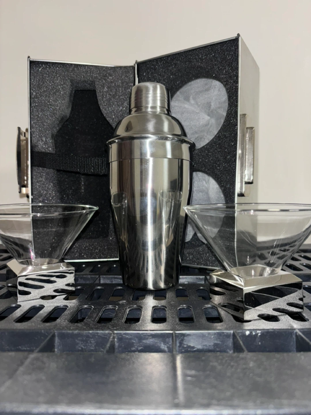 60Selling a complete cocktail set called "The Two Martini Lunch"! It includes a stainless steel cocktail shaker and two martini glasses, all neatly packed in a stylish metal carrying case. Perfect for making and enjoying your favorite martinis!