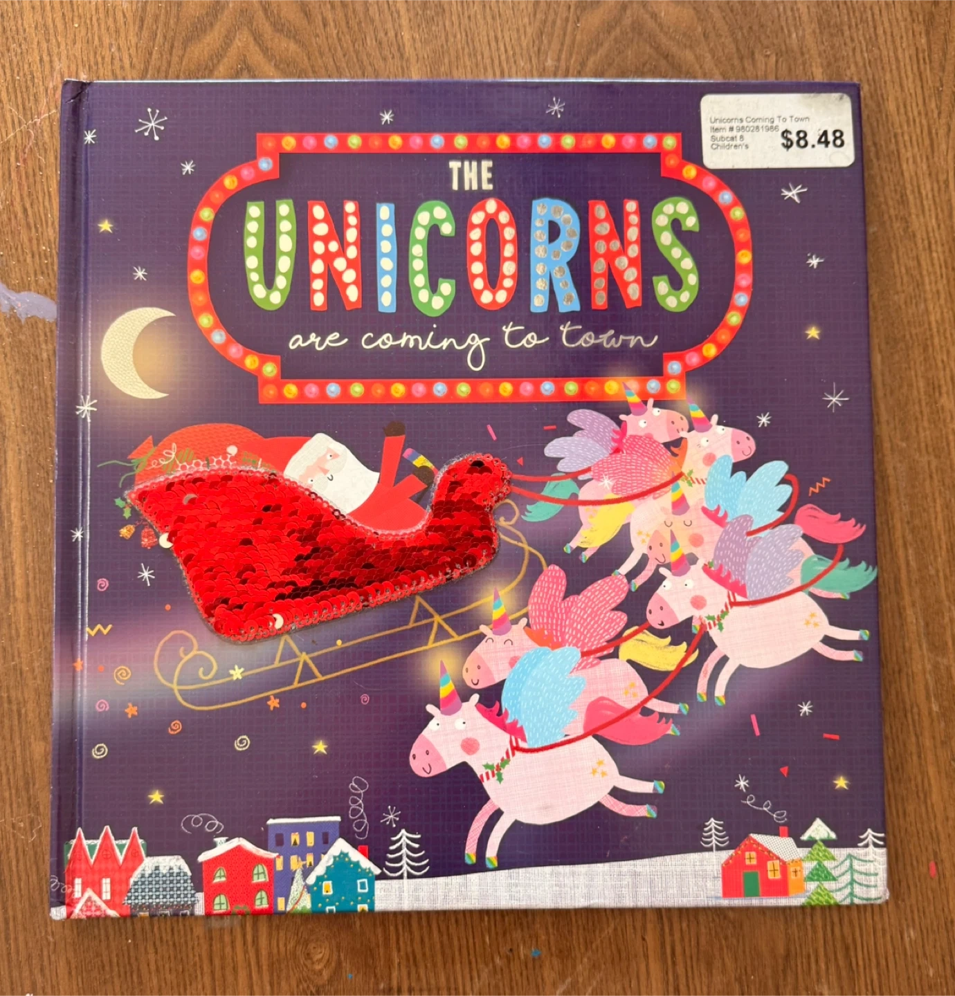 I'm selling a children's book titled "The Unicorns Are Coming to Town"! The cover features a colorful illustration of unicorns, Santa in a sleigh, and festive town scenery. Originally priced at $8.48, this book is perfect for young readers who love unicorns and holiday themes