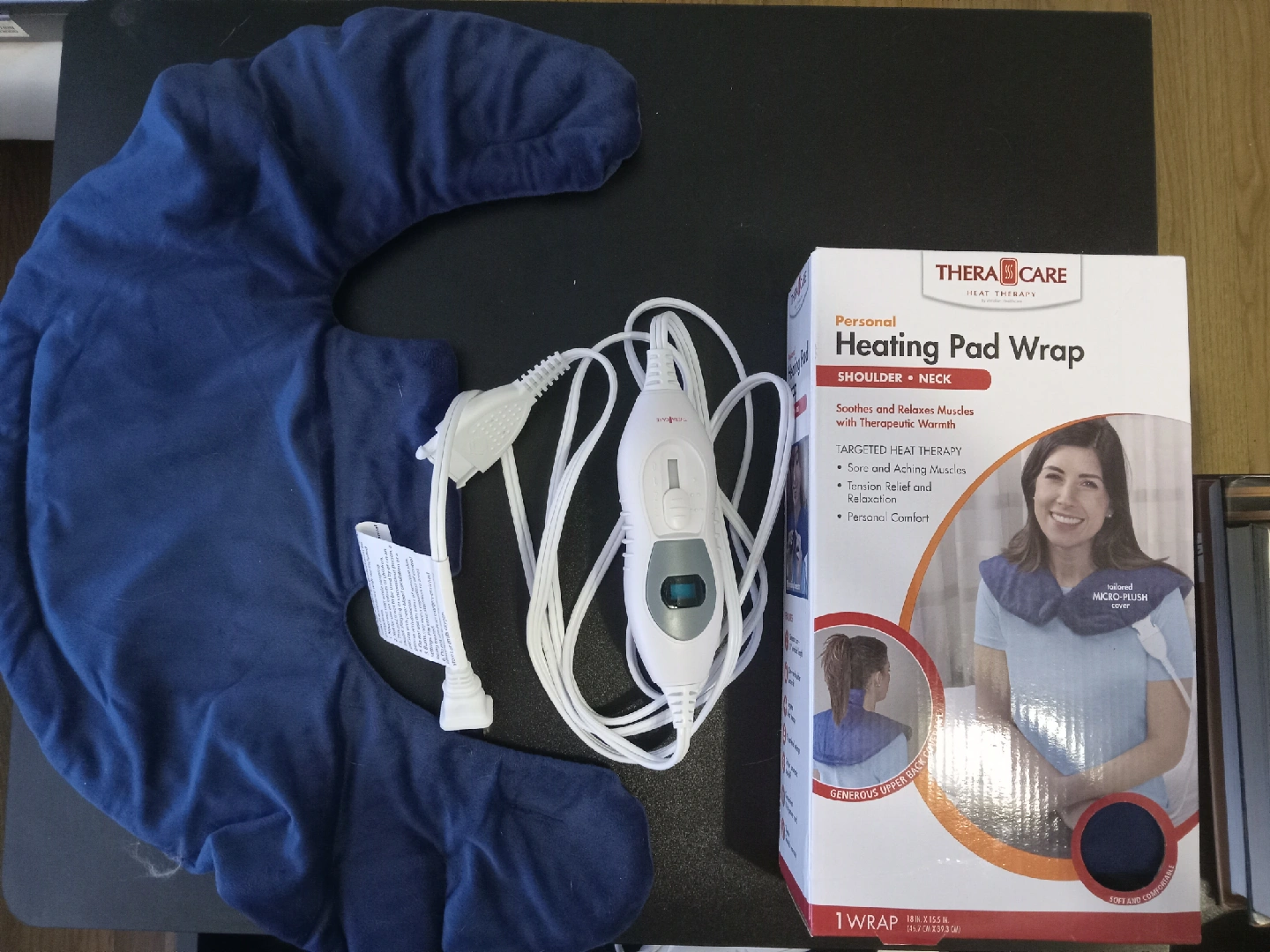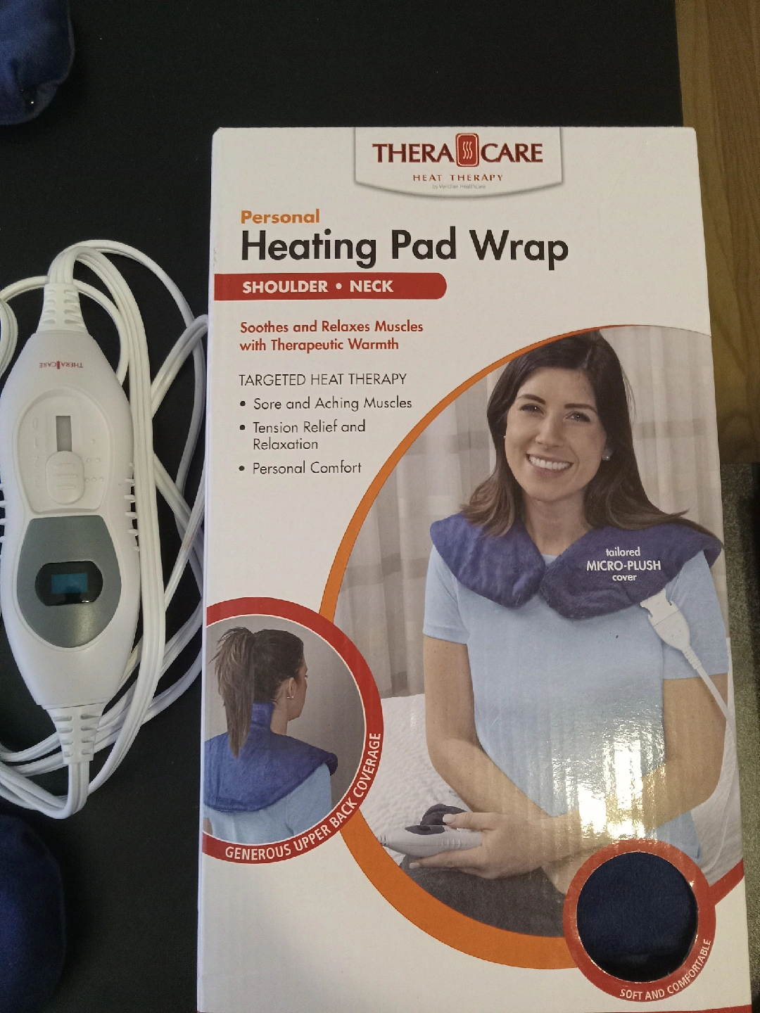 I'm selling a TheraCare Personal Heating Pad Wrap designed for the shoulder and neck area. It soothes and relaxes muscles with therapeutic warmth. It targets sore and aching muscles, providing tension relief and relaxation, and offers personal comfort. The wrap features a tailored micro-plush cover and generous upper back coverage. It's soft and comfortable and comes with the box!