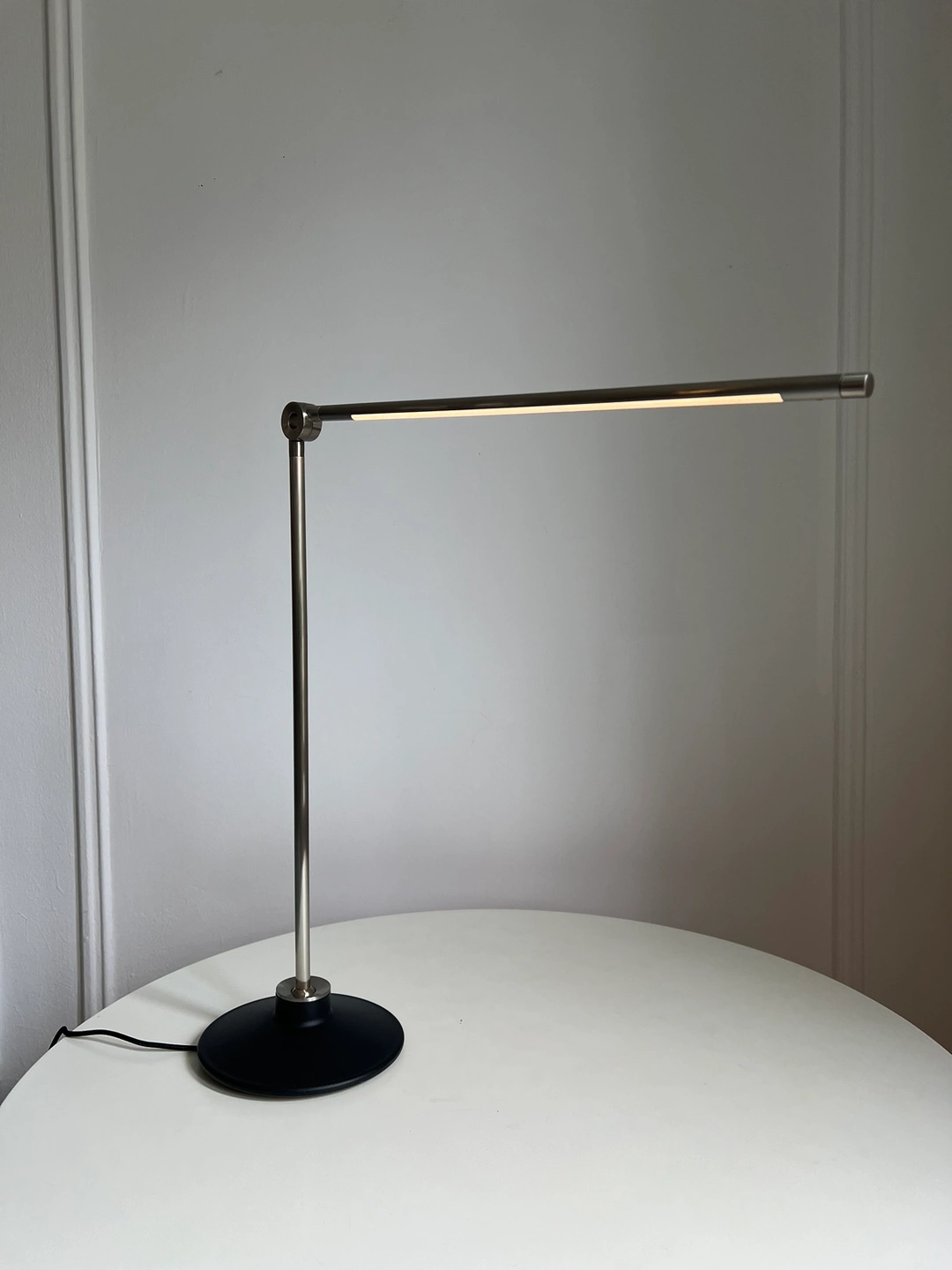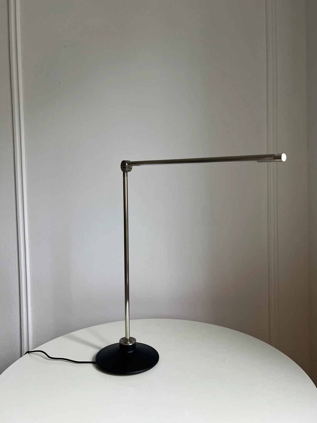 High design brand, illuminates through a frosted lens for functional task lighting, adjustable lamp with a fully articulating hinge, elegant and minimal design.