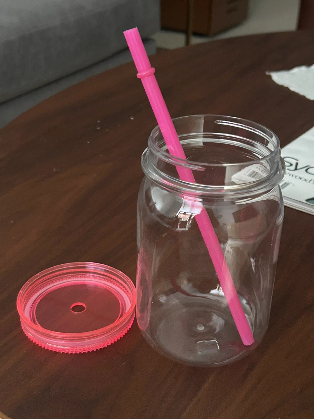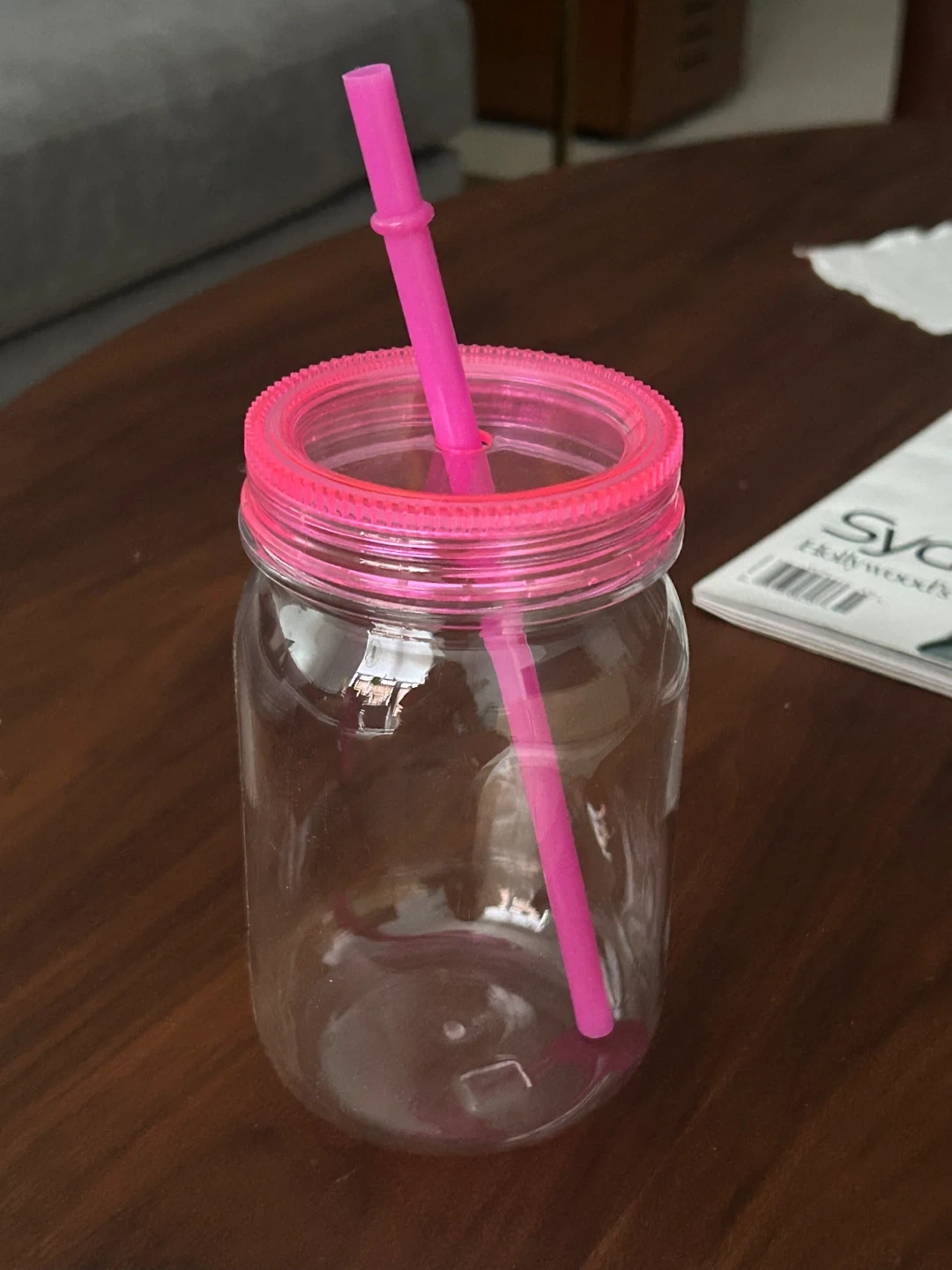62selling a new Think Positive plastic mason jar with a pink straw! New in box. Great for gifting & staying hydrated!