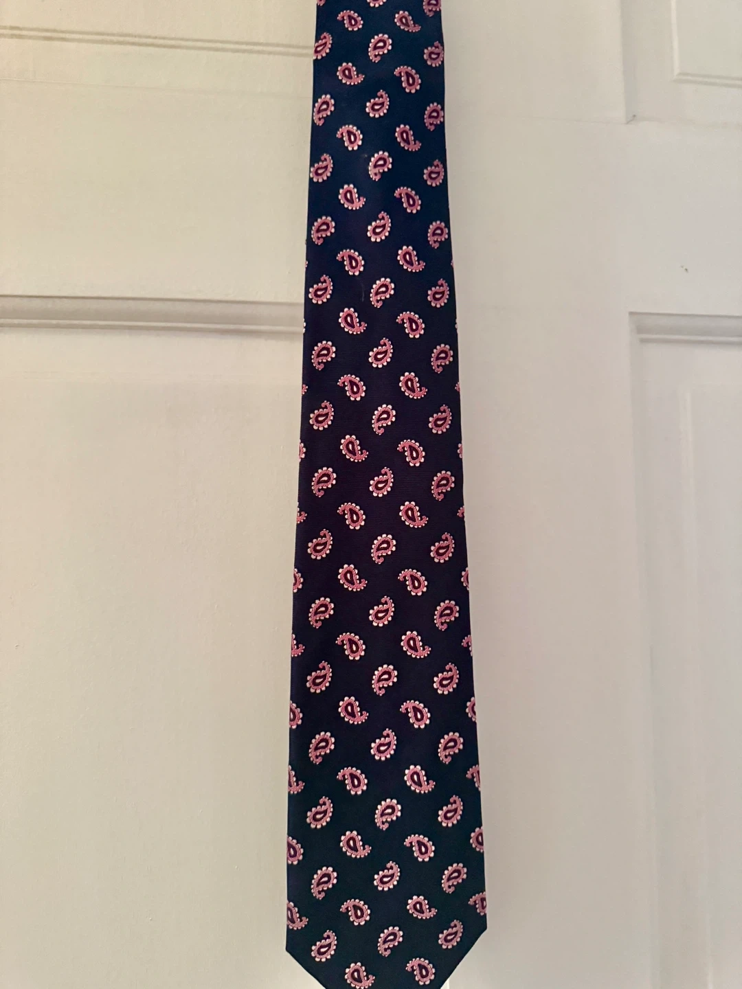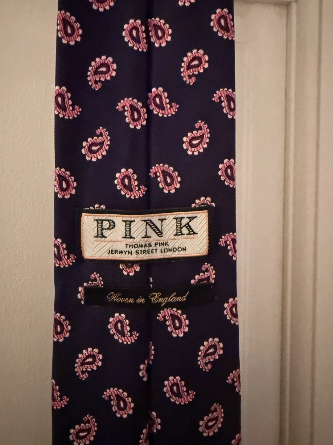 211Selling a Thomas Pink necktie with a navy background and pink paisley pattern. It is woven in England and in great condition!