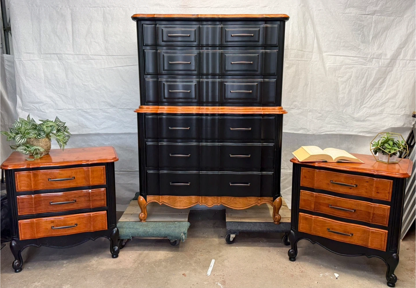 0Selling a Thomasville w/ dovetail drawers. Completely refinished. Triple Dresser with mirror, Tall dresser and 2 nightstands. Dimensions: Long dresser 72x20x33 - Tall 39x20x54 Night stands 25x26x25.5. Let me know if you're interested! Local pick up only