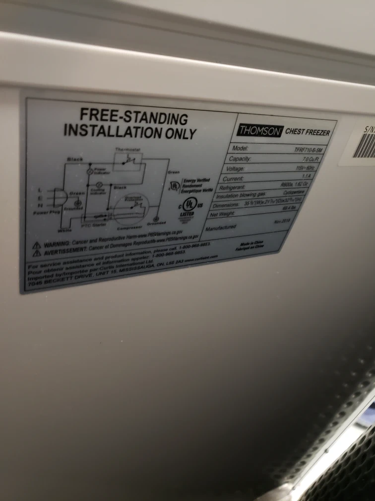 27Selling a Thomson chest freezer, model TRFF7106-SM. It has a capacity of 7.0 cu ft. Dimensions are 35 1/5"W x 21 1/5"D x 32 7/10"H. Manufactured in Nov 2018
