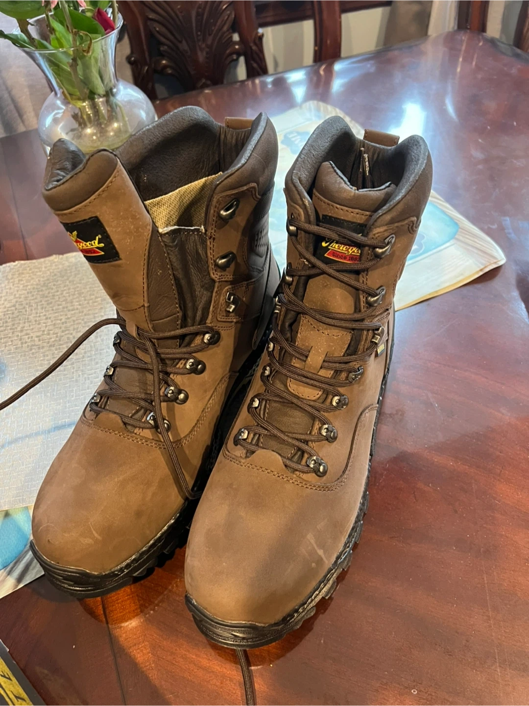 Selling a pair of Thorogood waterproof boots in brown. They appear to be in good condition and ready for your next adventure! These boots are durable and perfect for outdoor activities