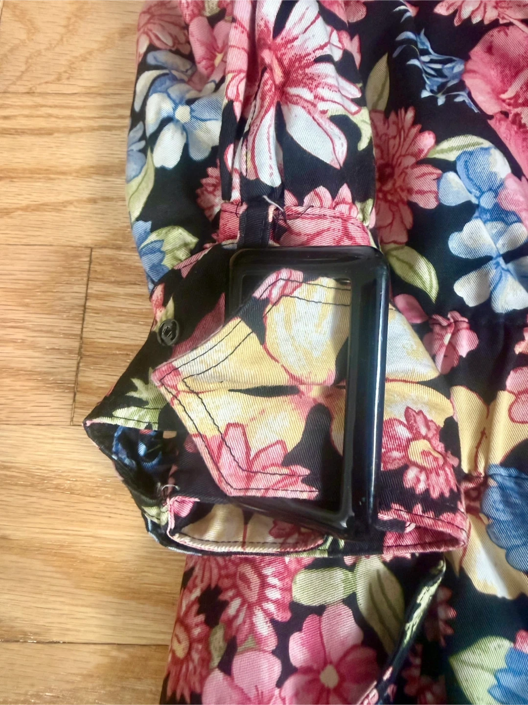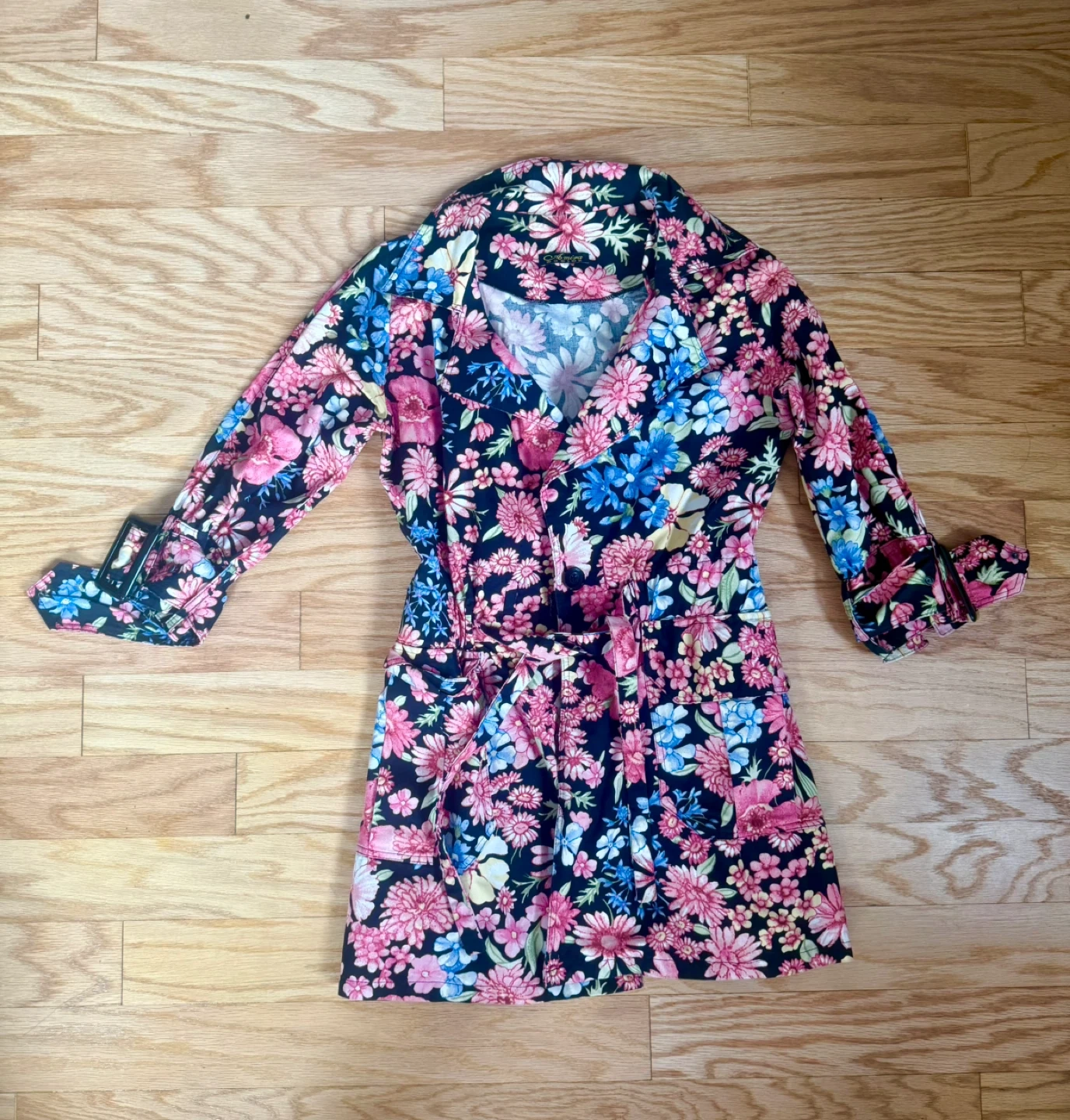 This trench coat features a vibrant floral print on a dark background. It has a collared neckline and button-up front. The waist is cinched with a tie belt and the cuffs have adjustable buckle straps.