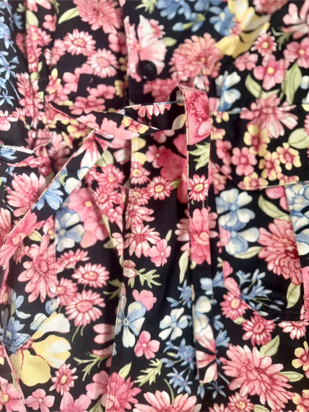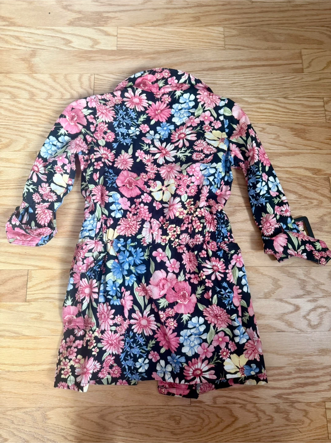 This trench coat features a vibrant floral print on a dark background. It has a collared neckline and button-up front. The waist is cinched with a tie belt and the cuffs have adjustable buckle straps.