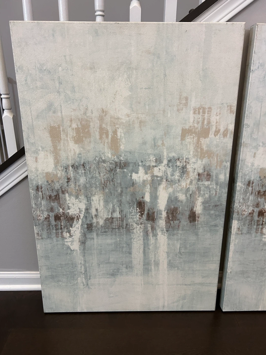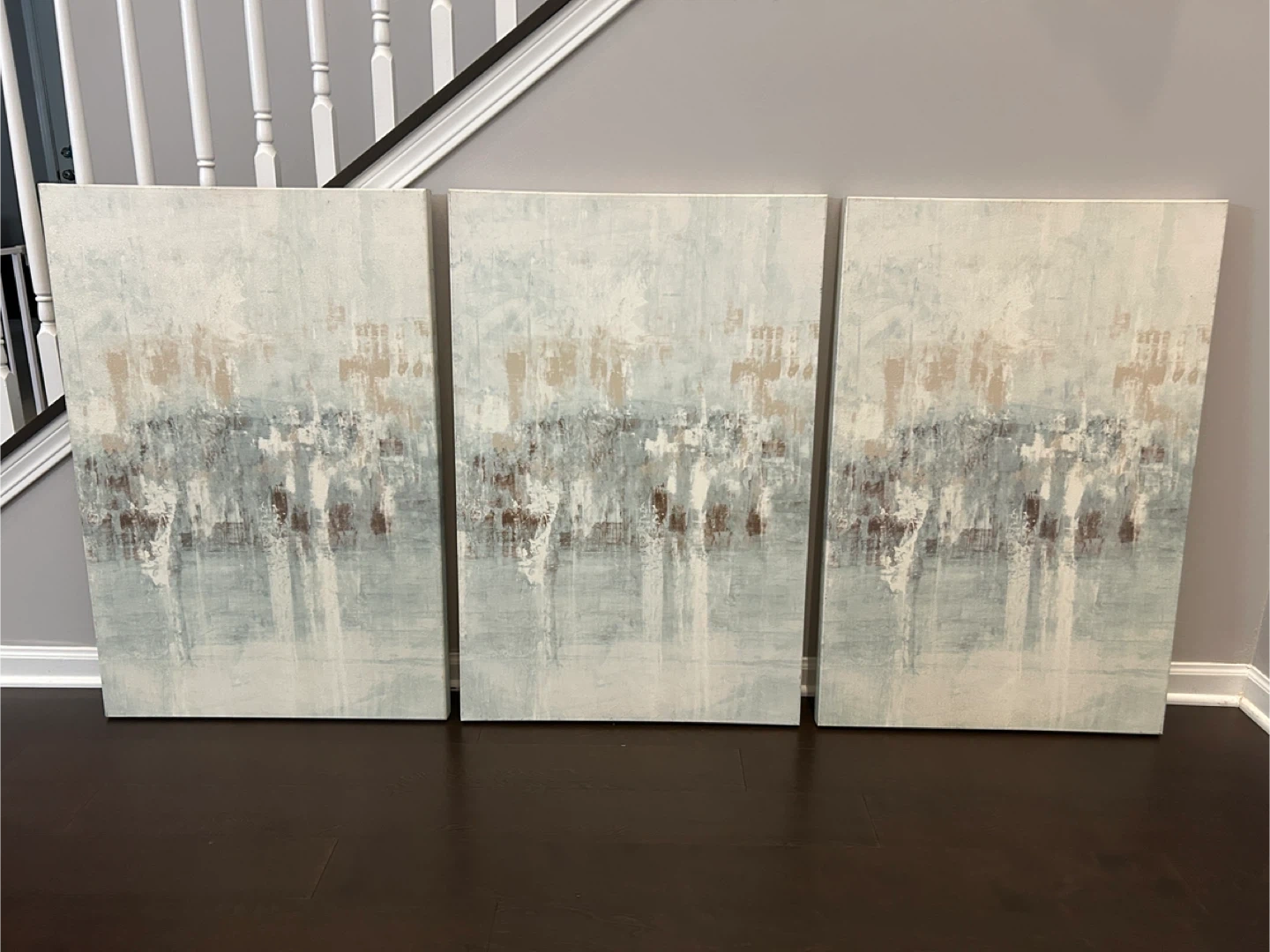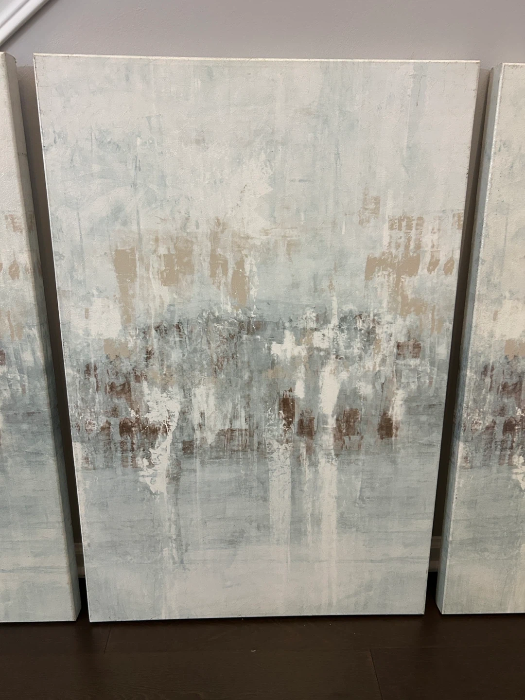 Selling a set of three abstract canvas paintings. They feature a calming color palette with shades of white, beige, and brown. These pieces would be perfect for adding a touch of modern art to your home! Measurements: 24x36 each painting Smoke free and pet free home Pick up In Romeoville IL 60446
