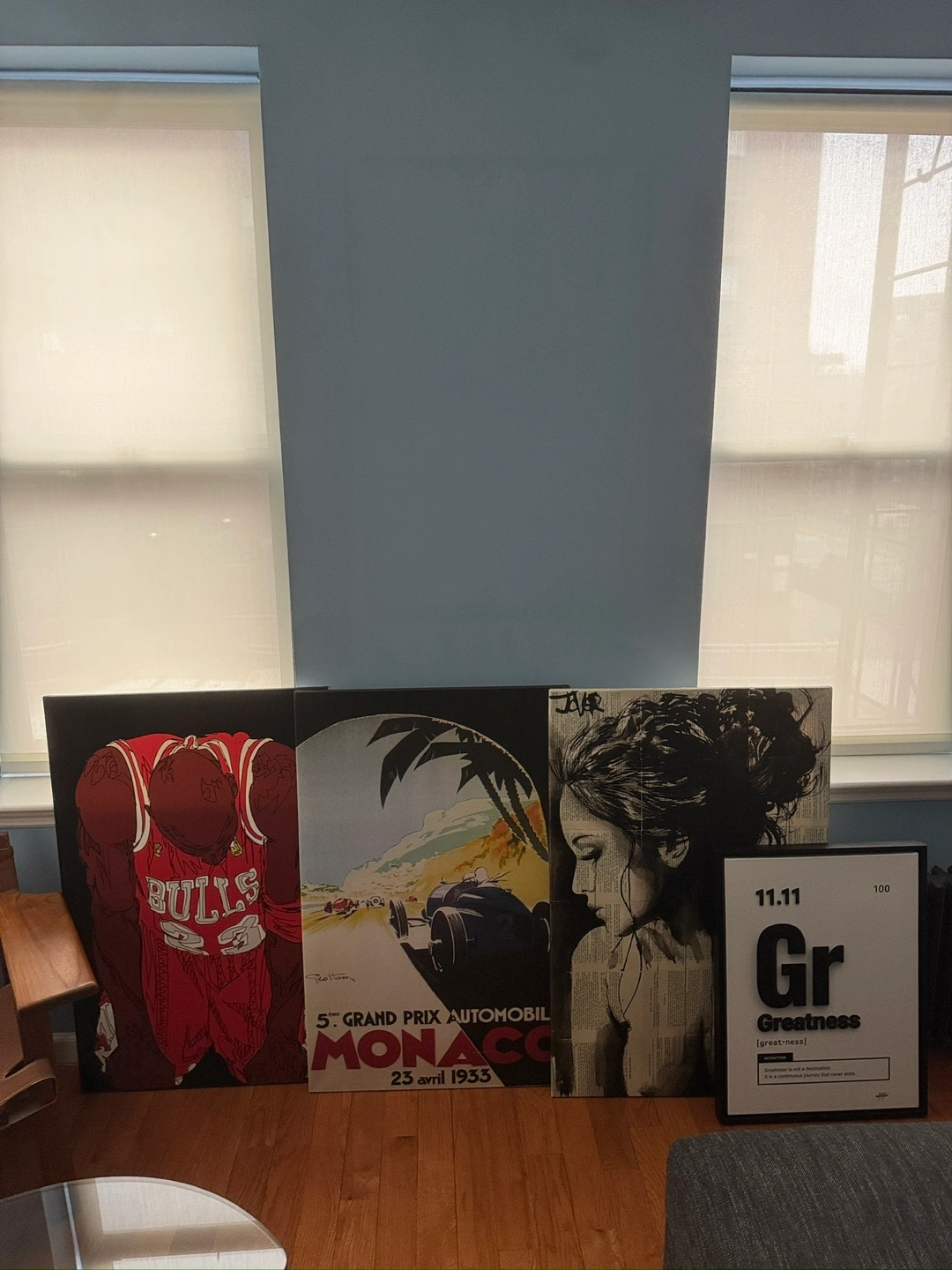 Set of three canvas prints. One features a Chicago Bulls basketball player, another depicts a vintage Grand Prix race in Monaco, and the third is a black and white stylized portrait. All in excellent condition.