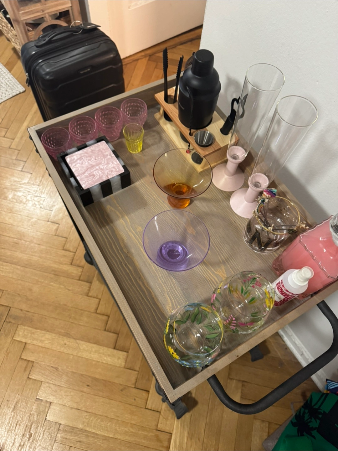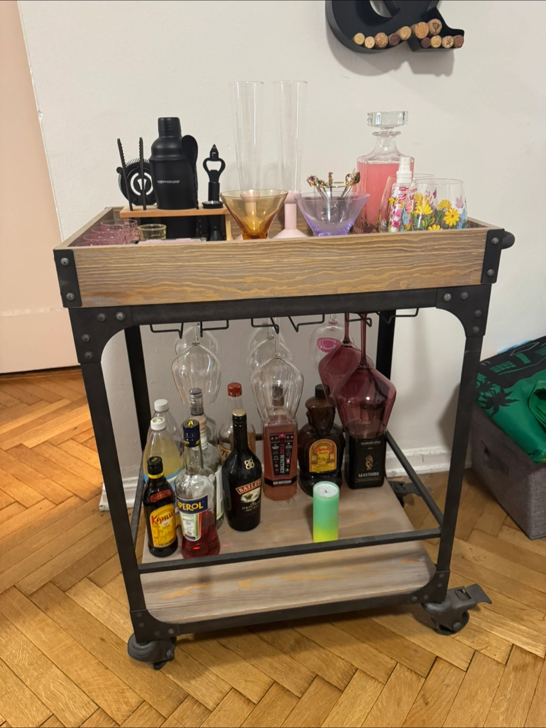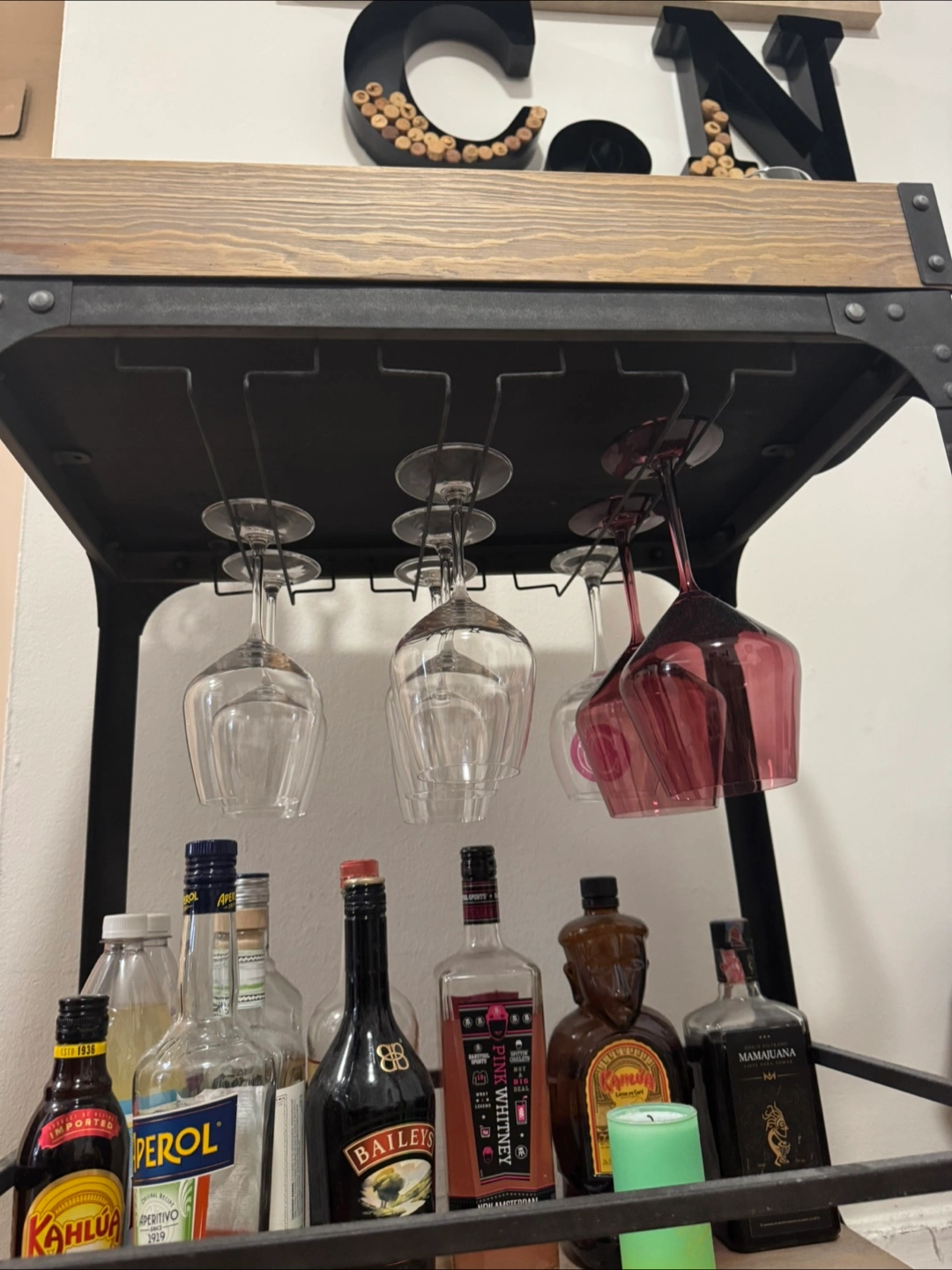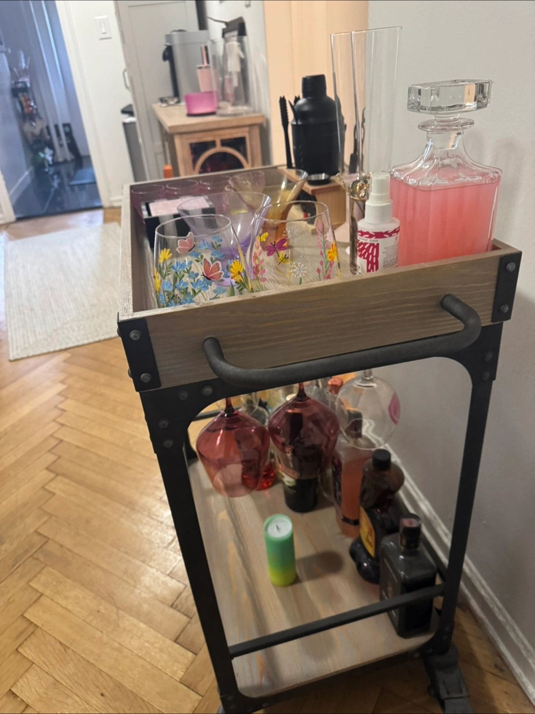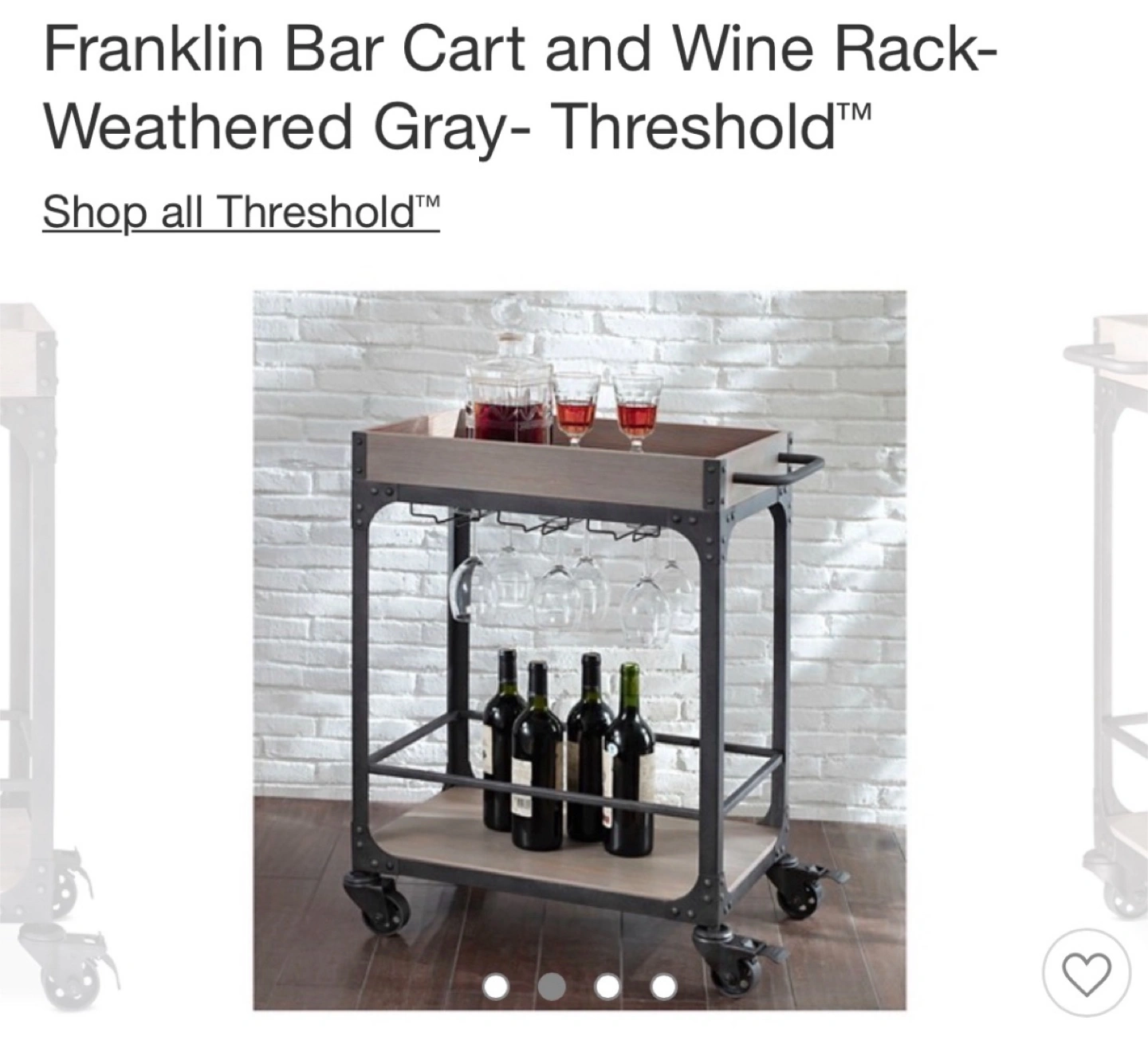 Selling a Threshold Franklin Bar Cart and Wine Rack in Weathered Gray. It's in great condition and ready to be the centerpiece of your home bar! Perfect for storing your favorite spirits and glassware. Dimensions: 32.5” H 16” D 24” L Wood and metal bar cart, wine rack fits up to 12 wine glasses. Has functional wheels and a lock to lock in place.