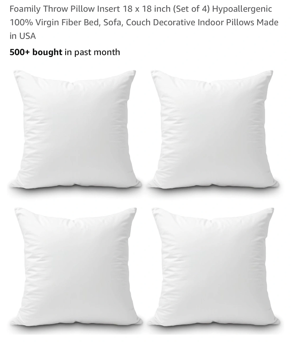 16Hypoallergenic 18x18 inch pillow inserts. 100% virgin fiber. Great for beds, sofas, and couches. Pet, smoke, child free home Separate cases available upon request
