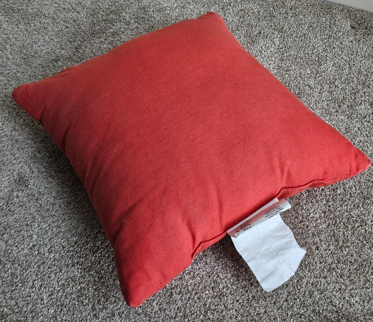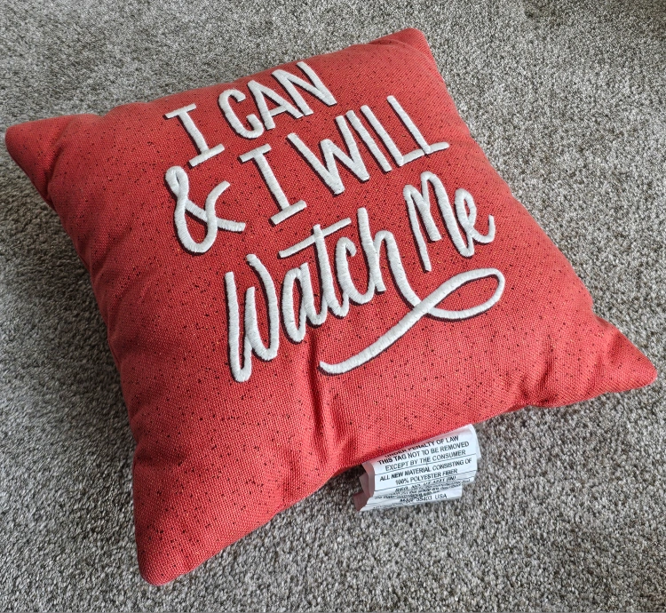 80This throw pillow is in great condition and features the phrase "I Can & I Will Watch Me" on a coral-colored background. It's made of 100% polyester fiberfill and is perfect for adding a touch of inspiration to any room