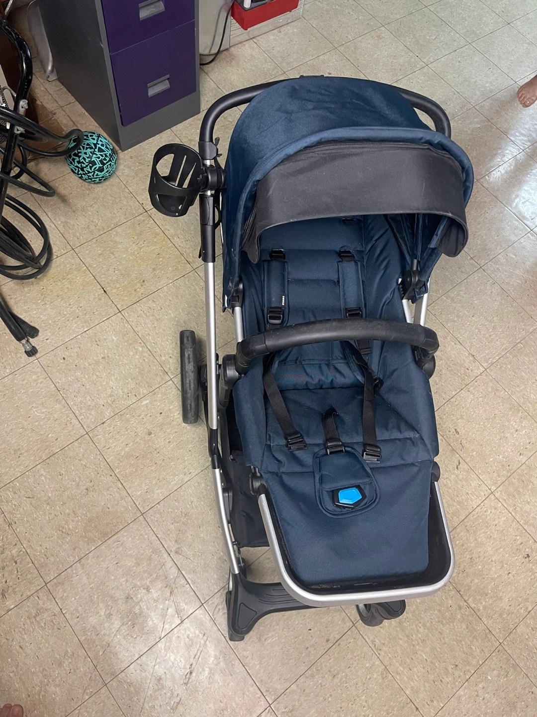 5Stroller in a navy blue fabric. It has a front bar and an overhead cover. A cup holder is attached. The seat has multiple straps and a buckle. Perfect for a leisurely walk in the park.