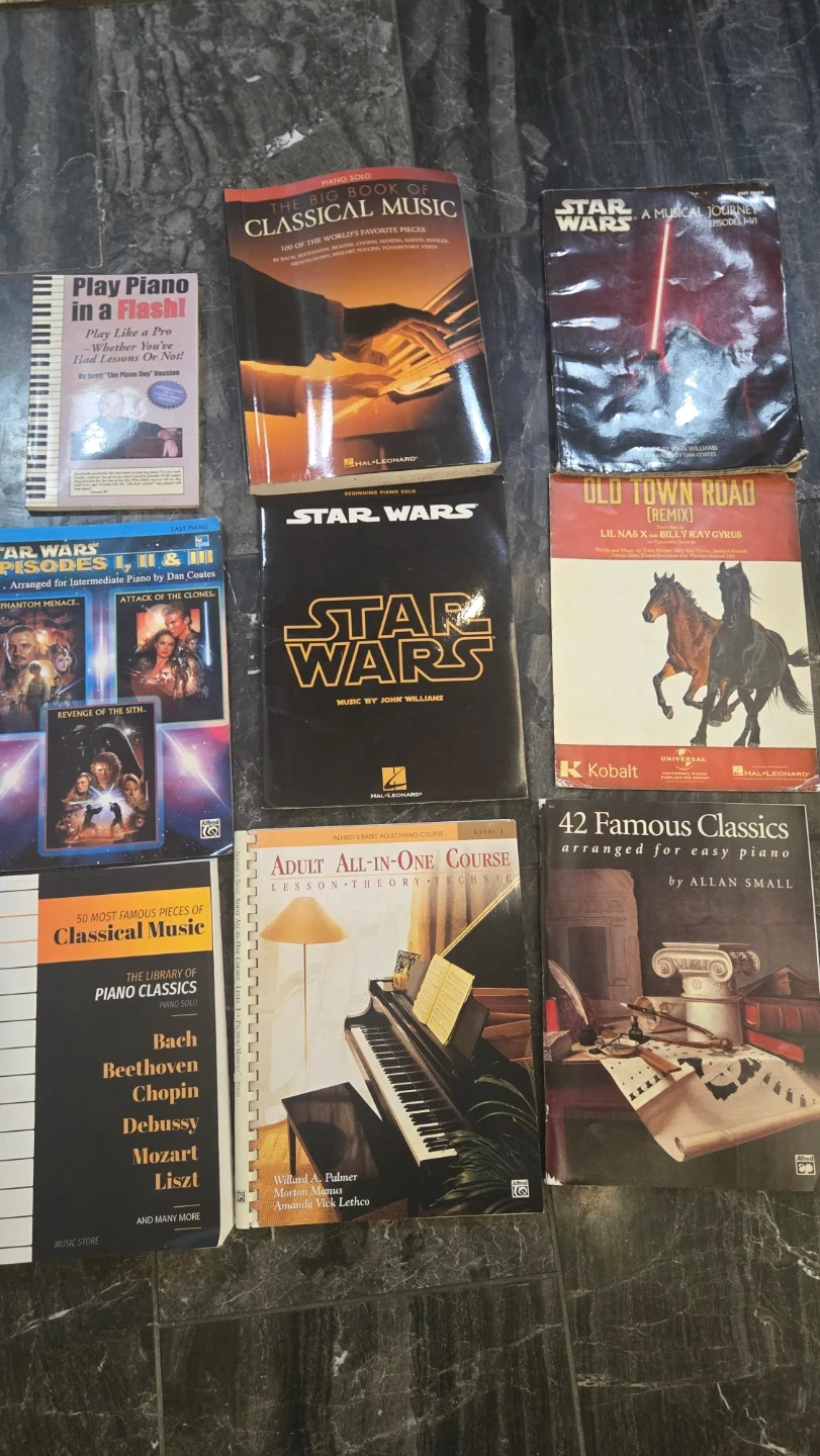 This is a lot of 9 piano sheet music books. It includes 'The Big Book of Classical Music,' '50 Most Famous Pieces of Classical Music,' 'Adult All-in-One Course,' and several Star Wars themed books. Also included is 'Old Town Road [Remix]'. They're arranged for piano, some for easy piano and intermediate piano.
