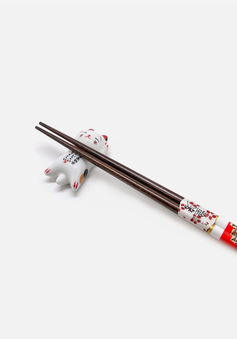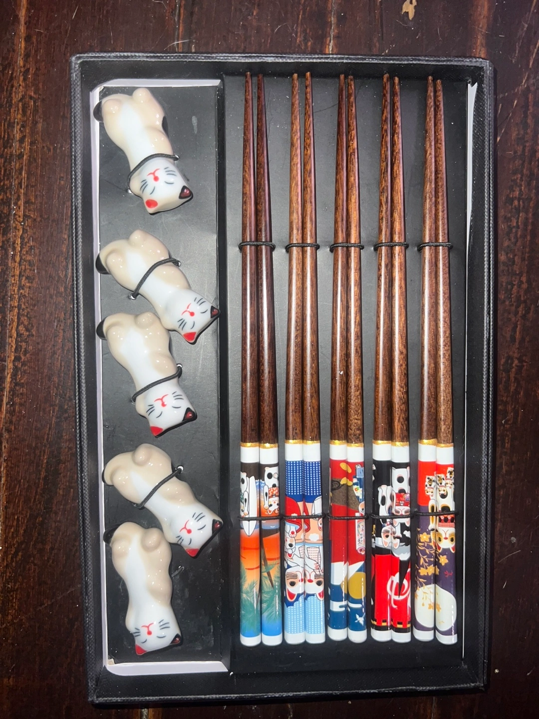 This is a really cute set of Tian Du Shan wood chopsticks! It comes with five pairs of chopsticks and five cat-shaped chopstick rests. The set is still in its original box, making it a great gift!