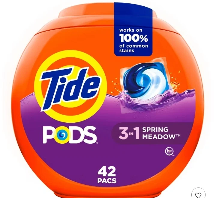 10Selling a container of Tide PODS 3-in-1 Spring Meadow laundry detergent pacs. This container has 42 pacs and works on 100% of common stains plastic bag