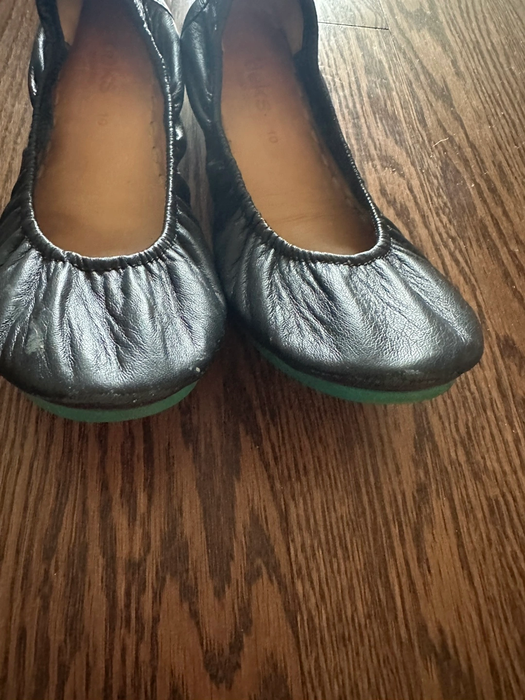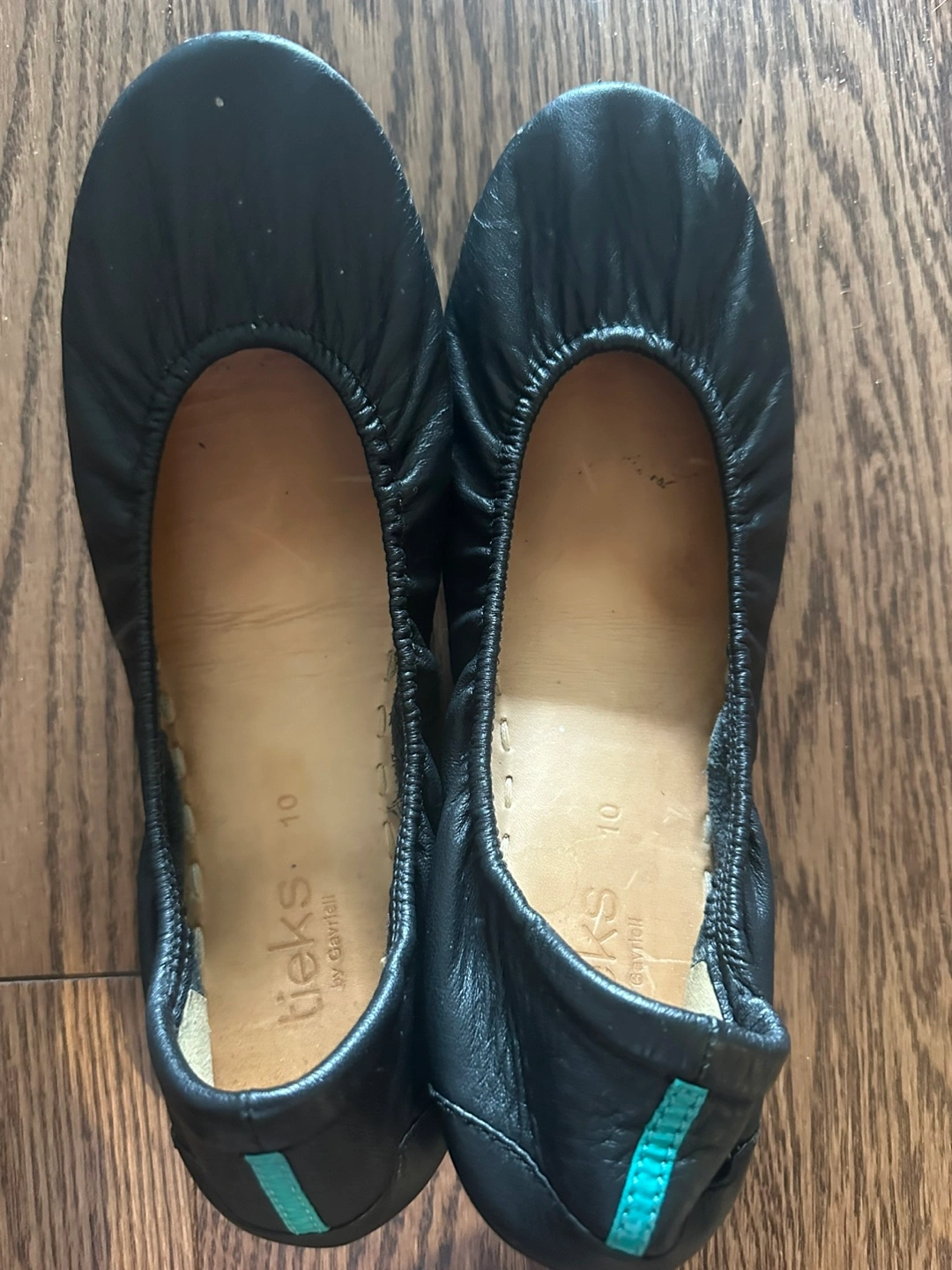 Selling a pair of black leather Tieks ballet flats in size 10. They show some signs of wear but are still in good condition for everyday use. These are super comfortable and perfect for running errands or a casual day out!