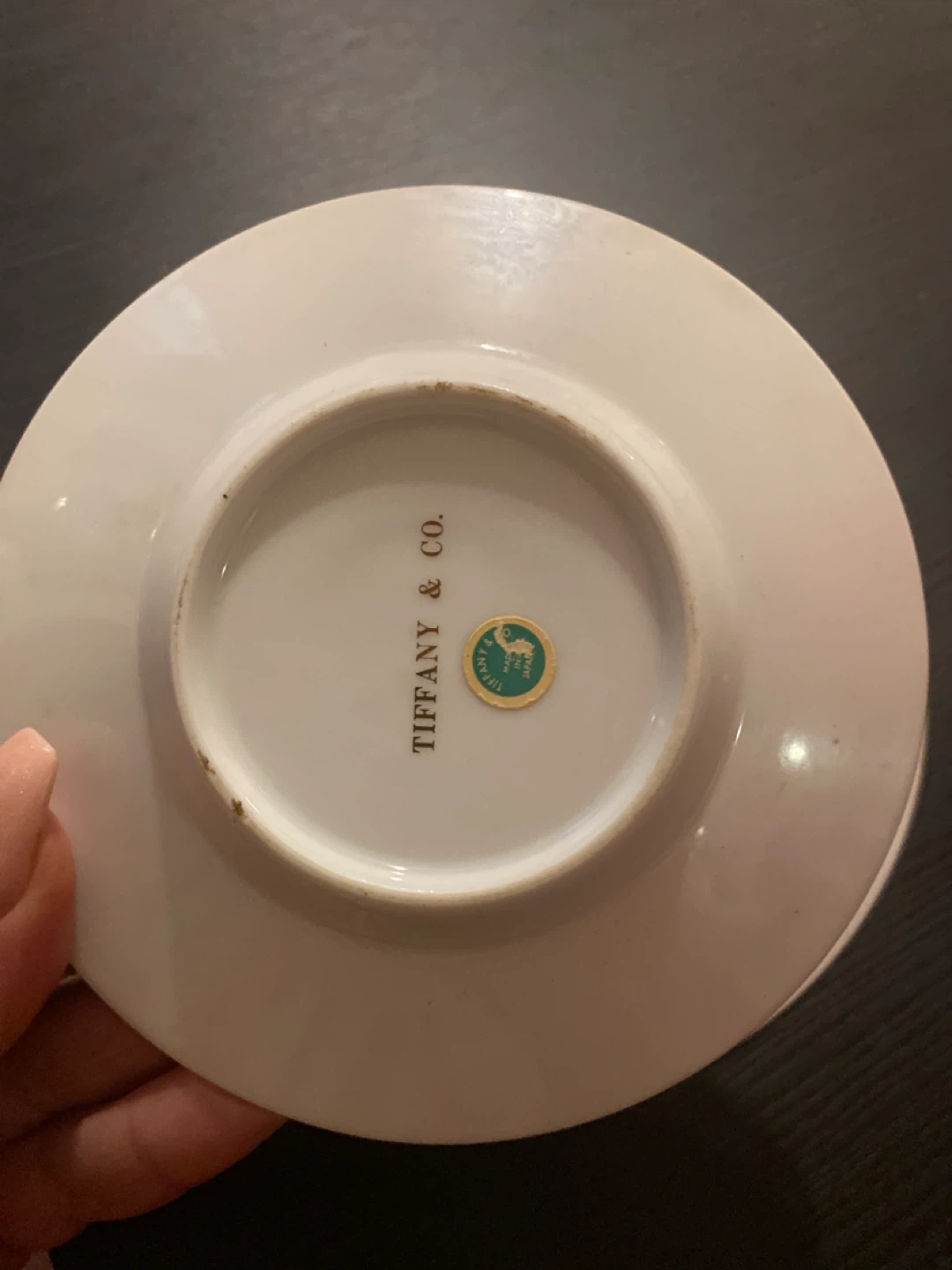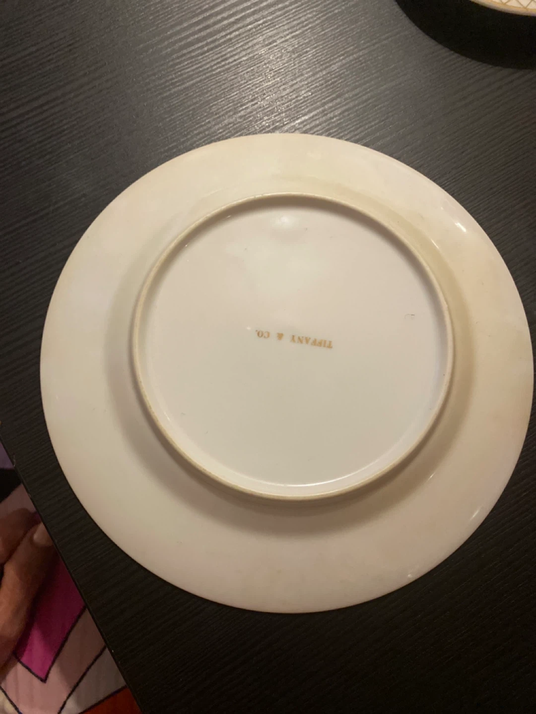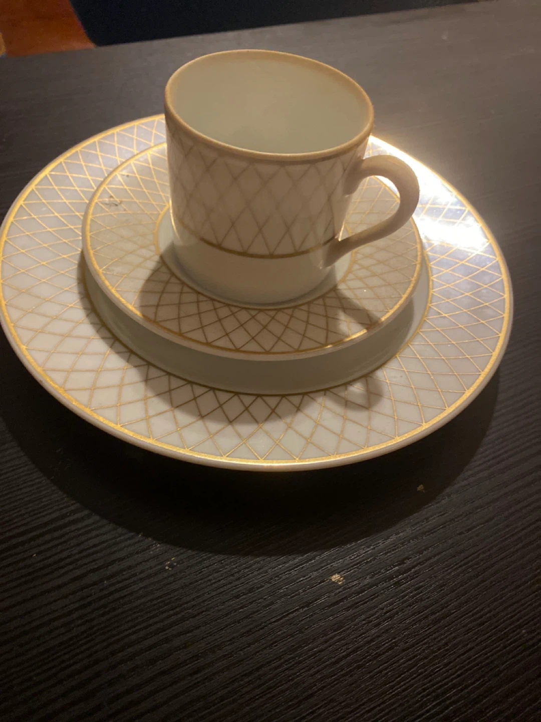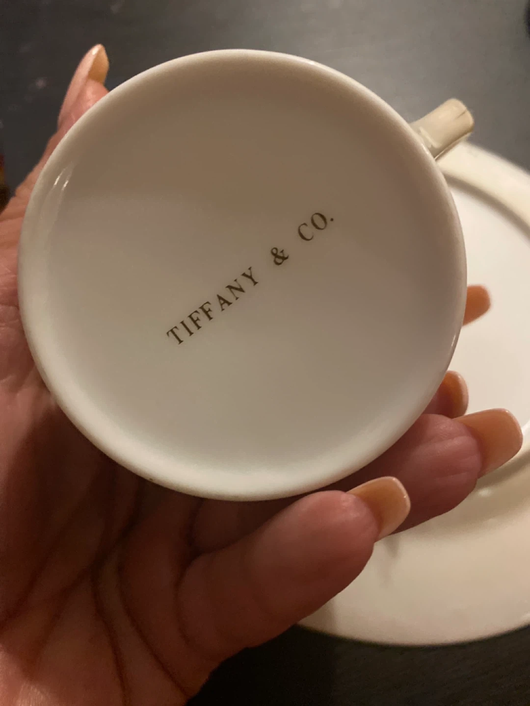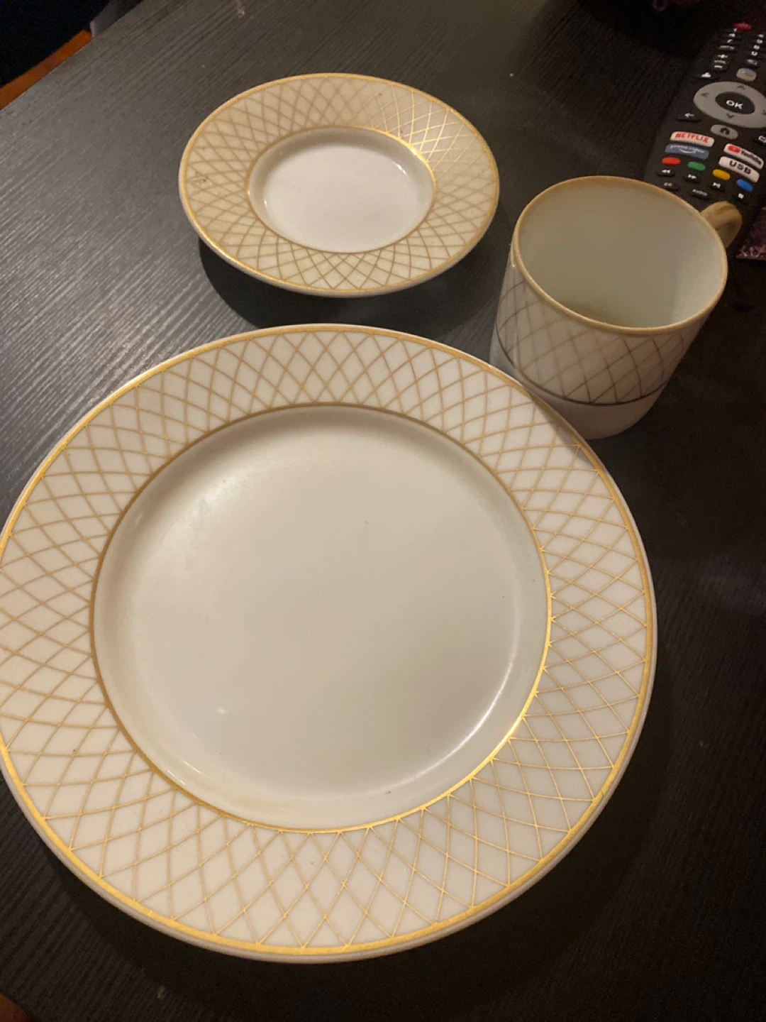 Selling a beautiful Tiffany & Co. dinnerware set! Includes a plate, saucer, and teacup. The set is white with a gold geometric pattern, adding a touch of elegance to any table setting serving for 4