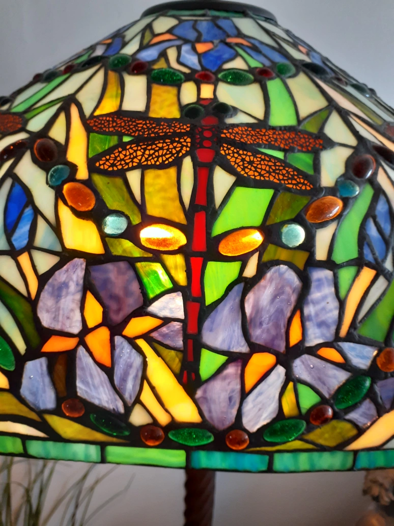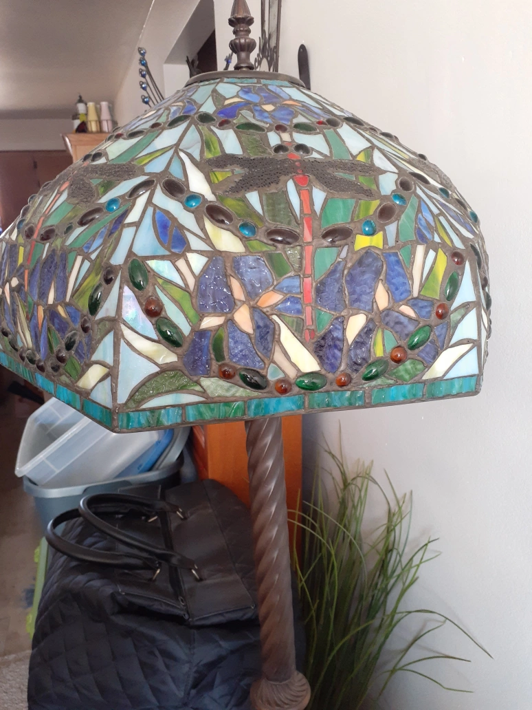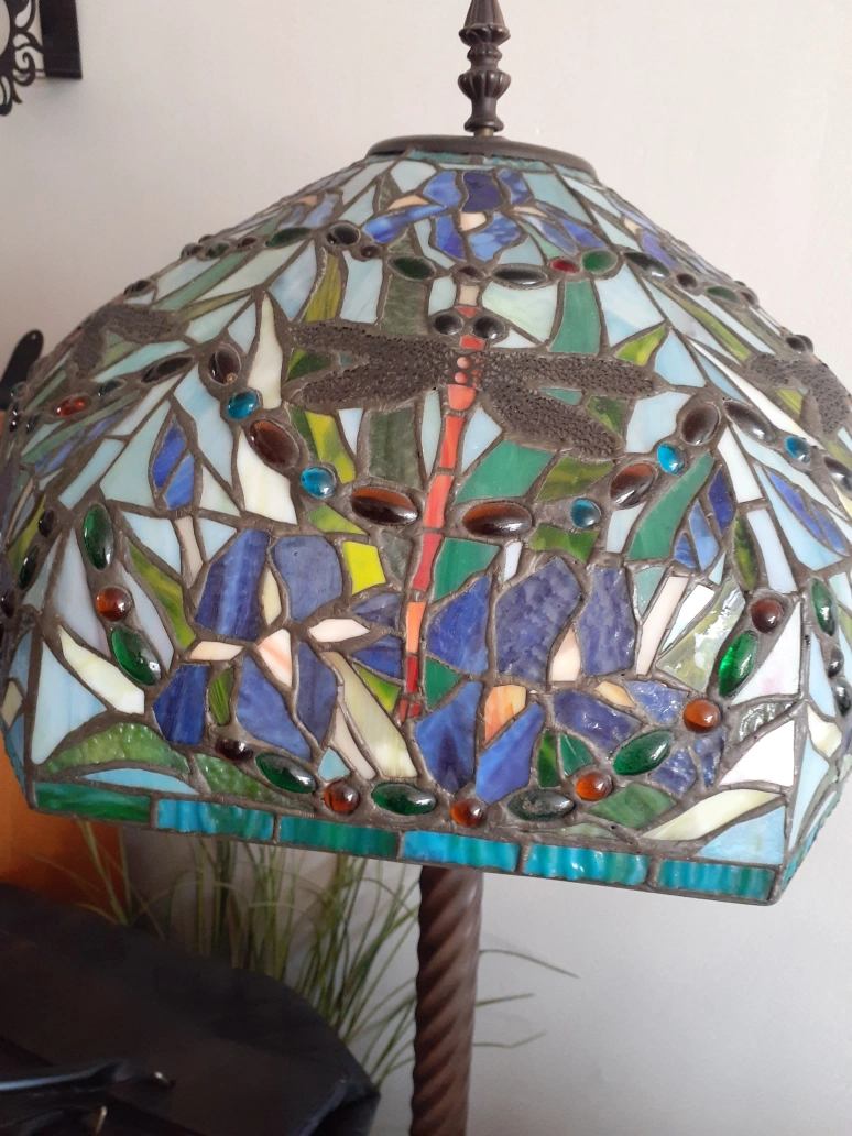 32Beautiful Tiffany style floor lamp with a dragonfly stained glass shade. It has a unique and intricate design that will add a touch of elegance to any room. The base has a twisted design with Marble design.