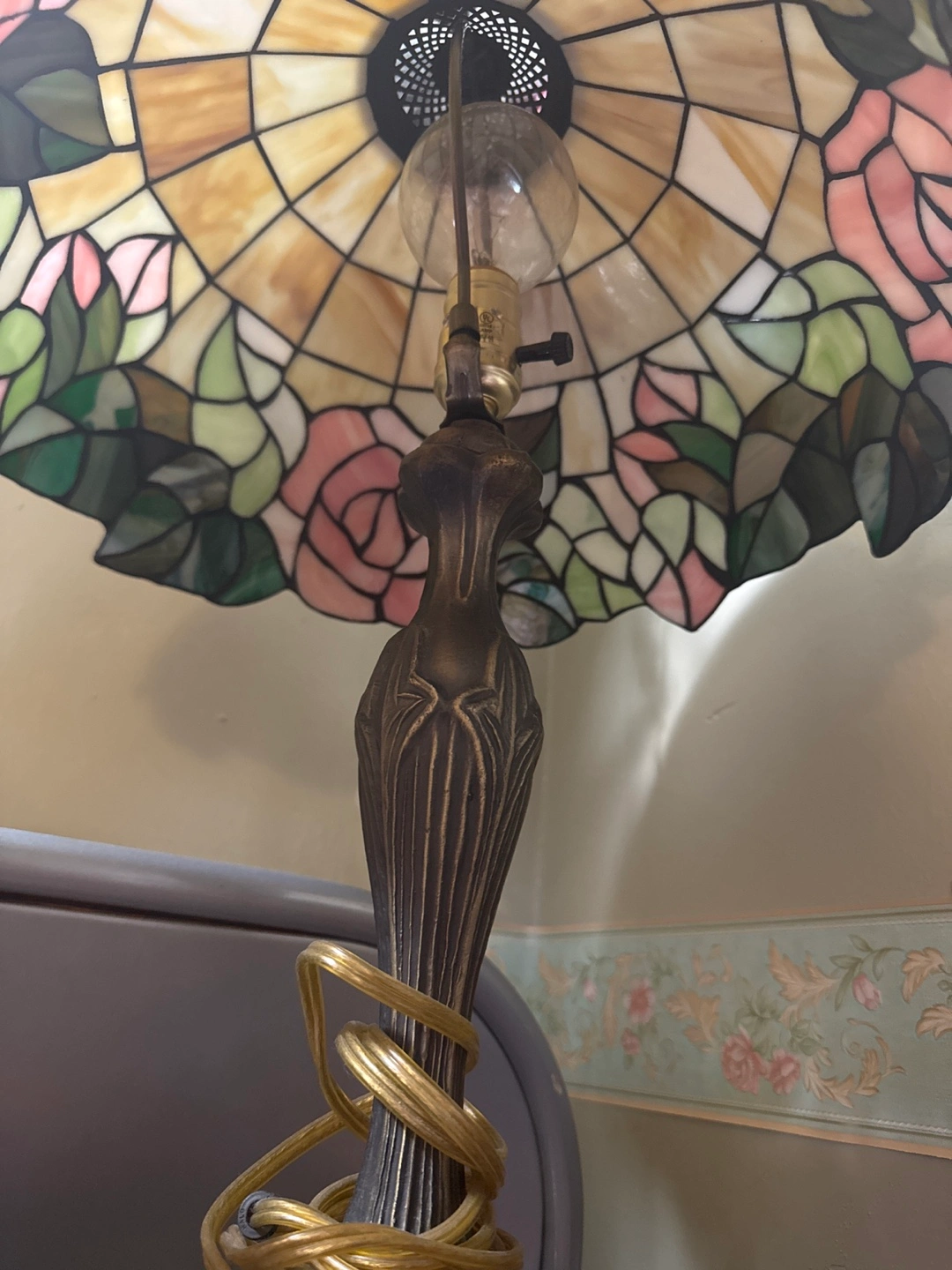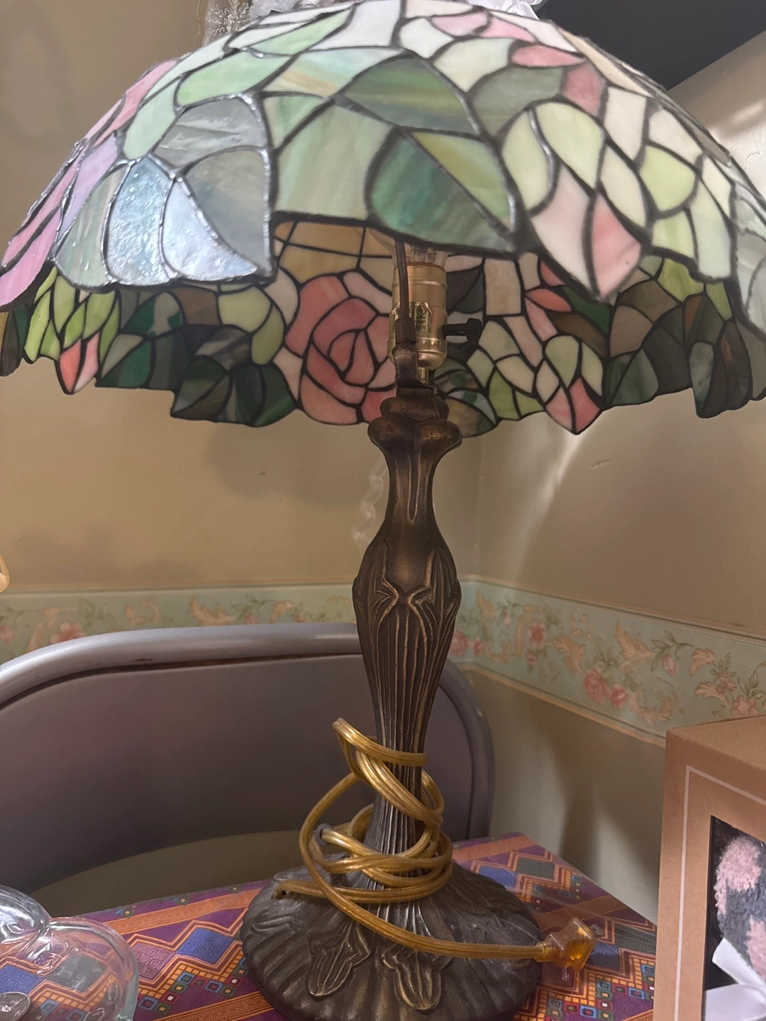 Beautiful stained glass lamp. Rose and leaf design. Dark bronze metal base. Electric cord included. Pre-owned.