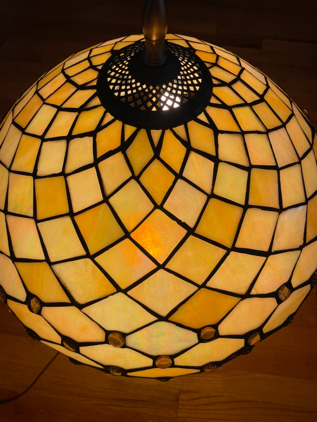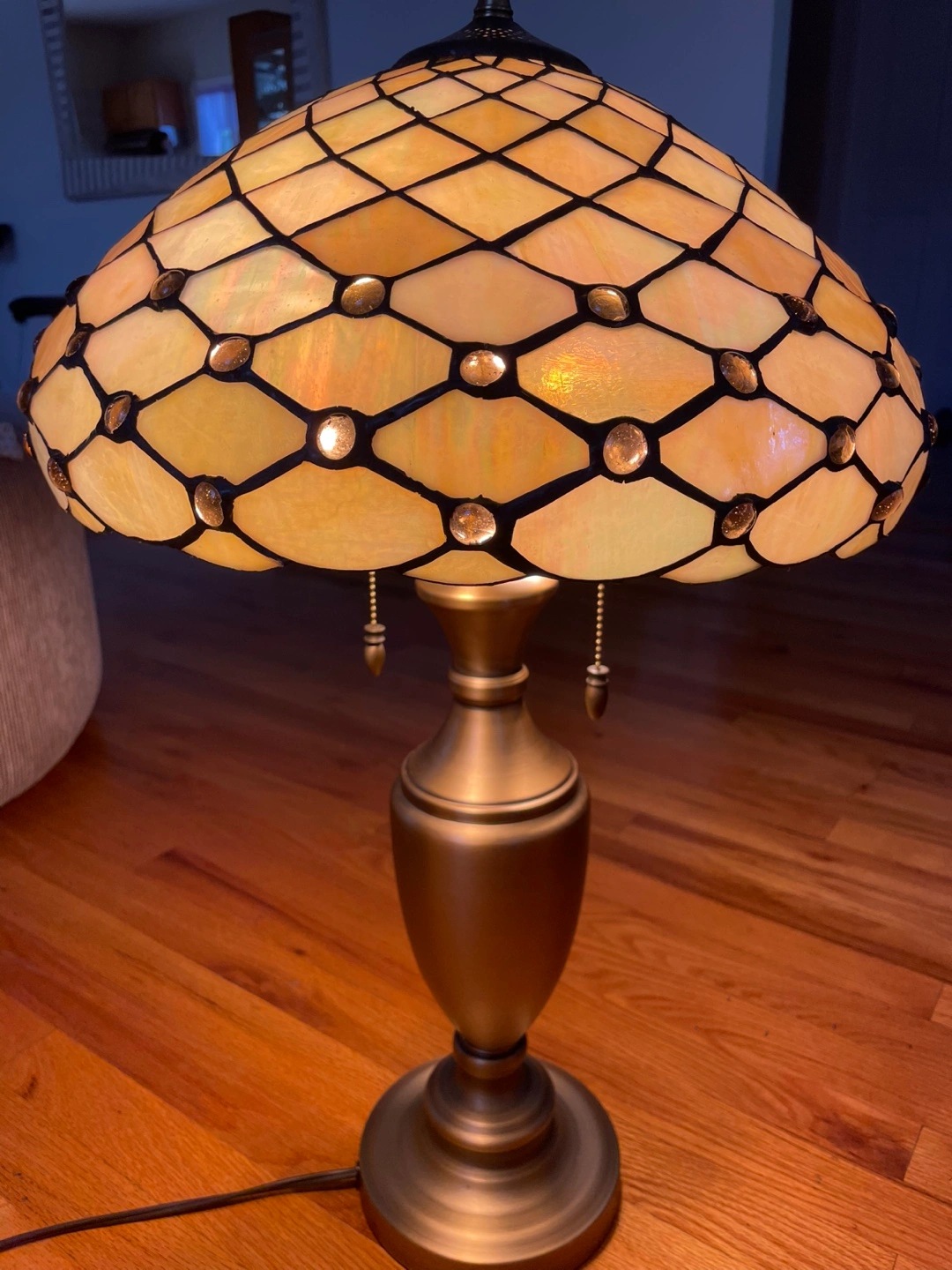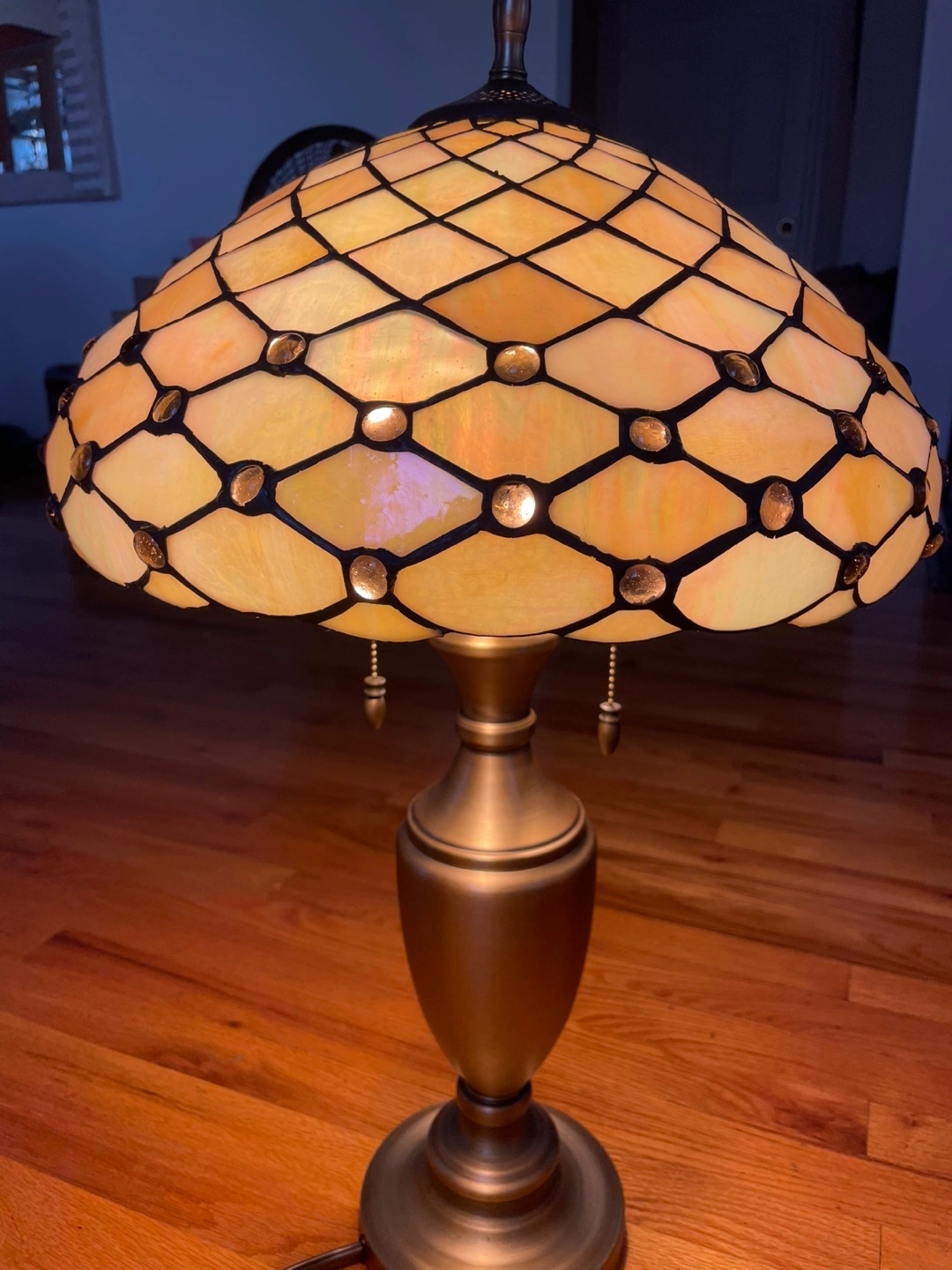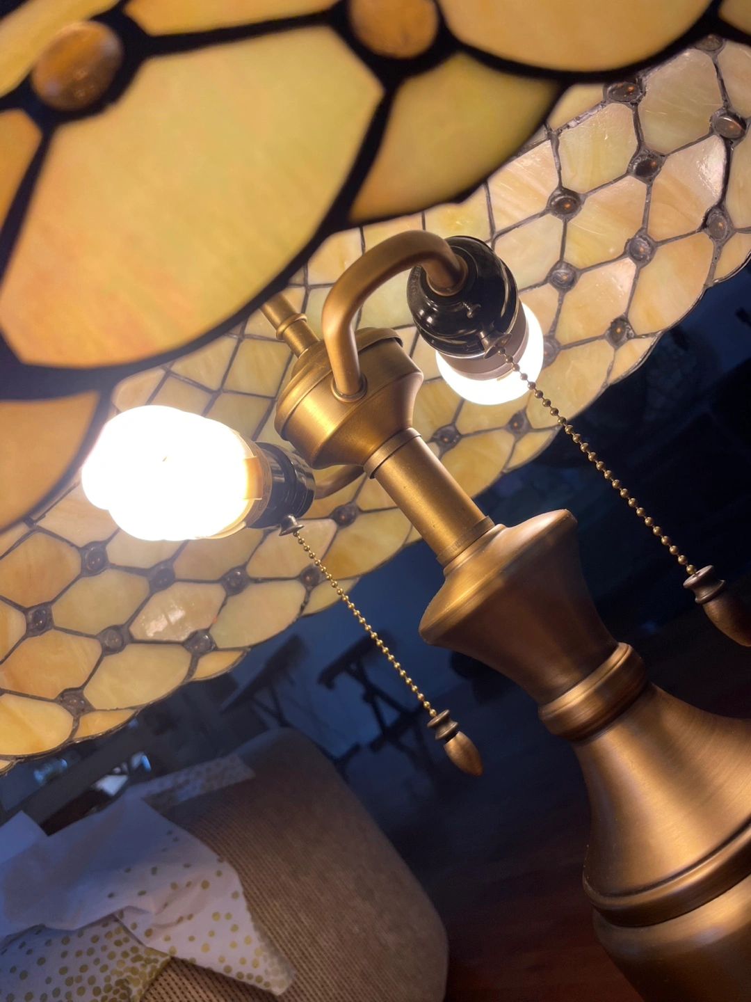 Beautiful Tiffany style table lamp with a unique mosaic design. The lamp features a bronze-colored base and a shade made of stained glass pieces in shades of yellow and white. It adds a warm and inviting glow to any room, 2 available, price is for each lamp, if buy 2 will discount on price, thanks for looking.