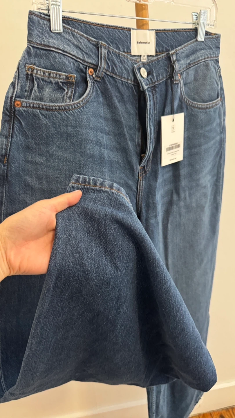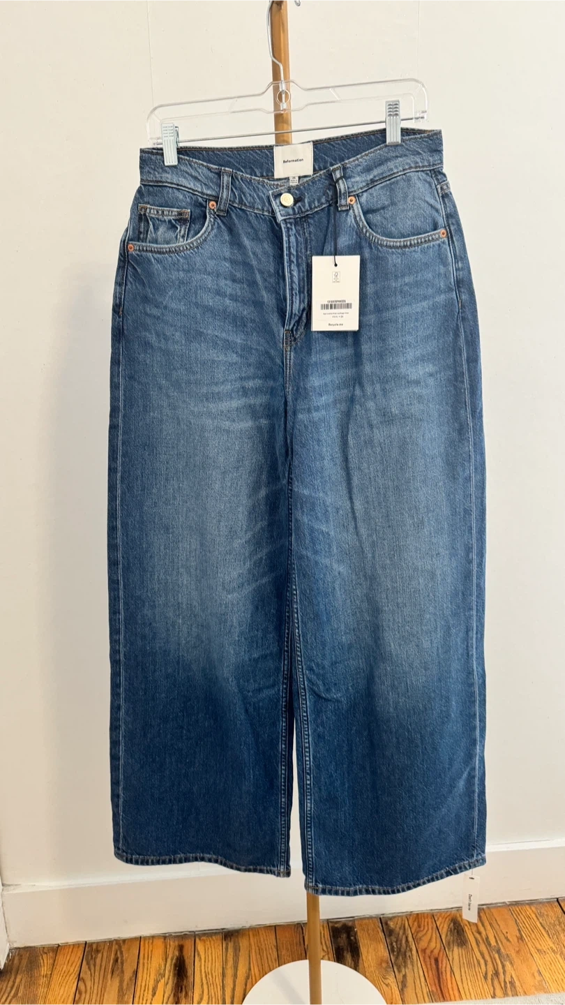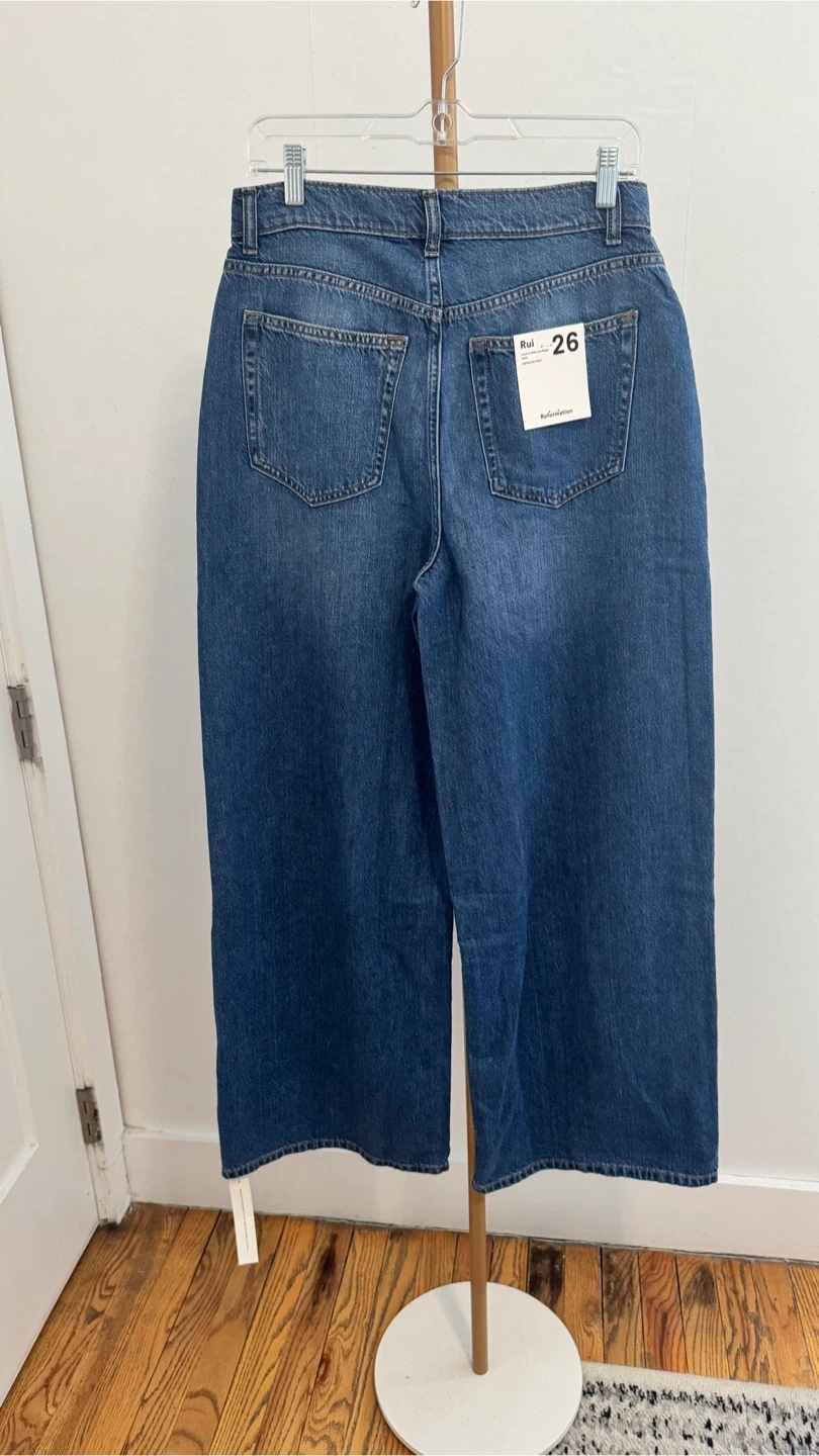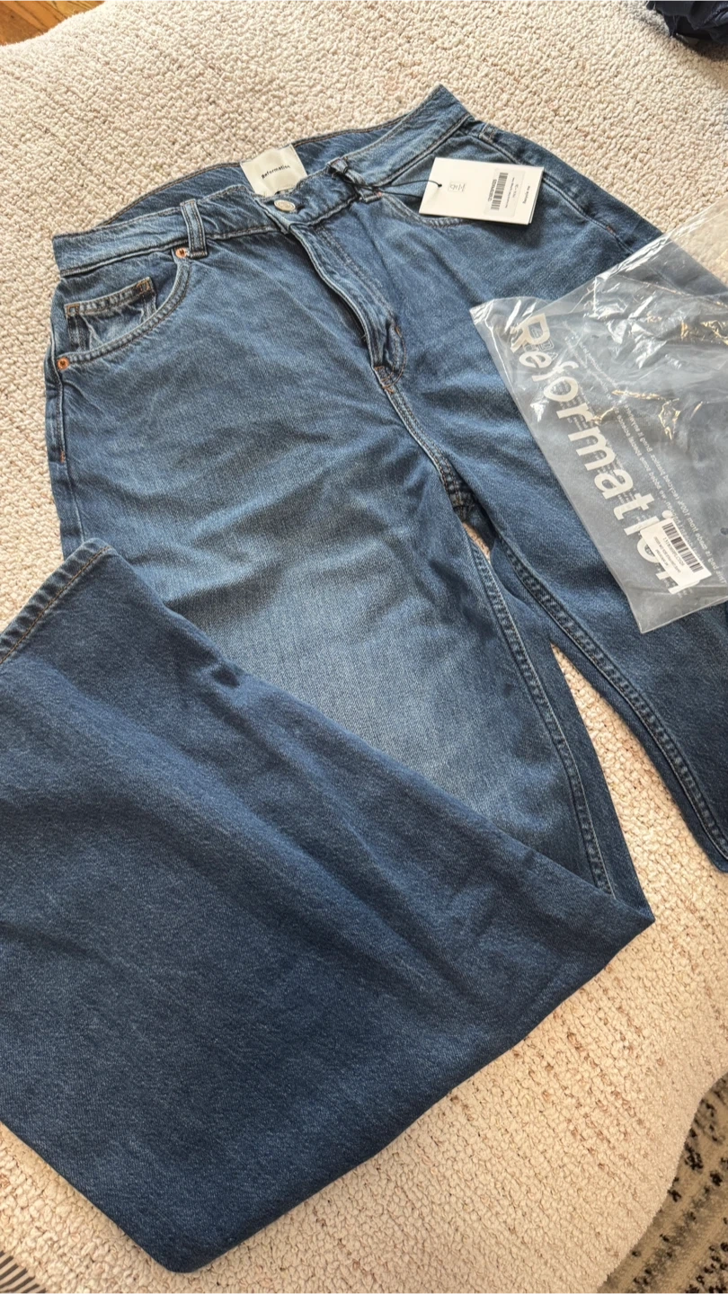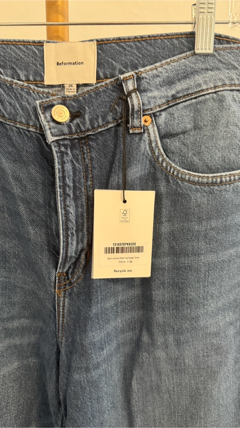 These are Reformation jeans in a size 26 fits larger, can fit 27. They're a classic blue denim wash and a wide-leg style. The material is denim.
